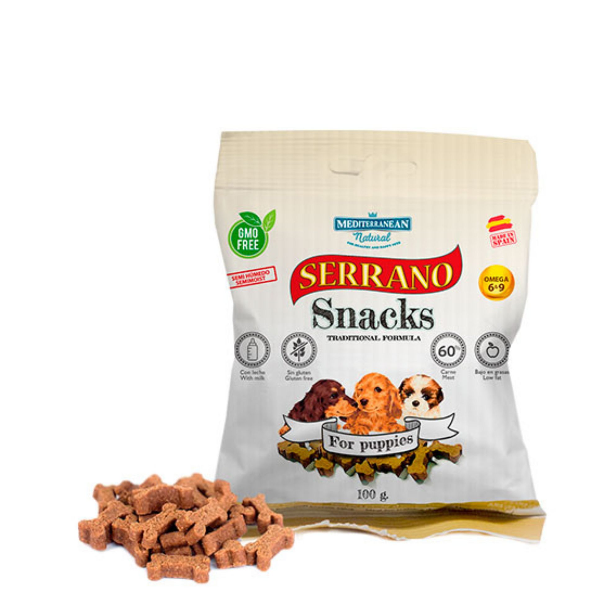 Os Snacks Serrano NATURAIS MEDITERRÂNEOS, delicadamente cortados em pequenos pedaços em forma de osso, garantem a segurança do seu animal de estimação, mantendo todos os seus nutrientes, refletindo uma dieta natural e contendo 70% de carne (60% nos “Snacks Serrano para cachorros”).