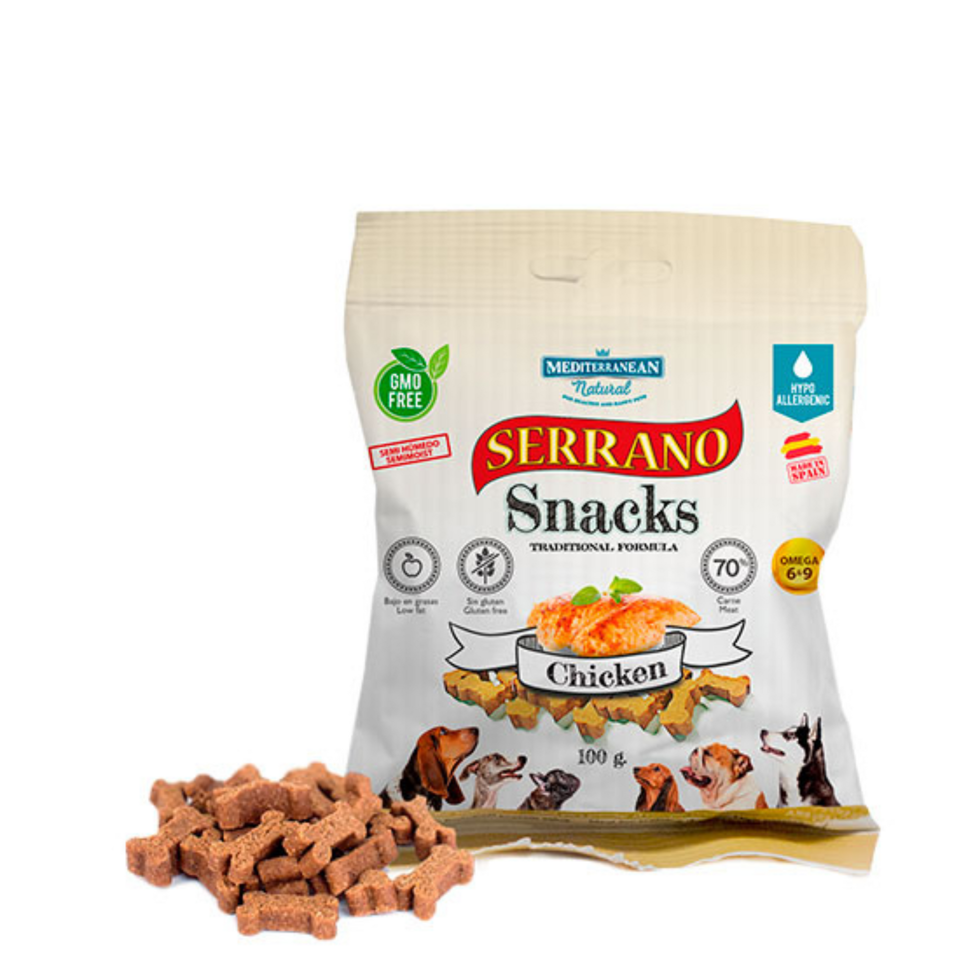 Os Snacks Serrano NATURAIS MEDITERRÂNEOS, delicadamente cortados em pequenos pedaços em forma de osso, garantem a segurança do seu animal de estimação, mantendo todos os seus nutrientes, refletindo uma dieta natural e contendo 70% de carne (60% nos “Snacks Serrano para cachorros”).