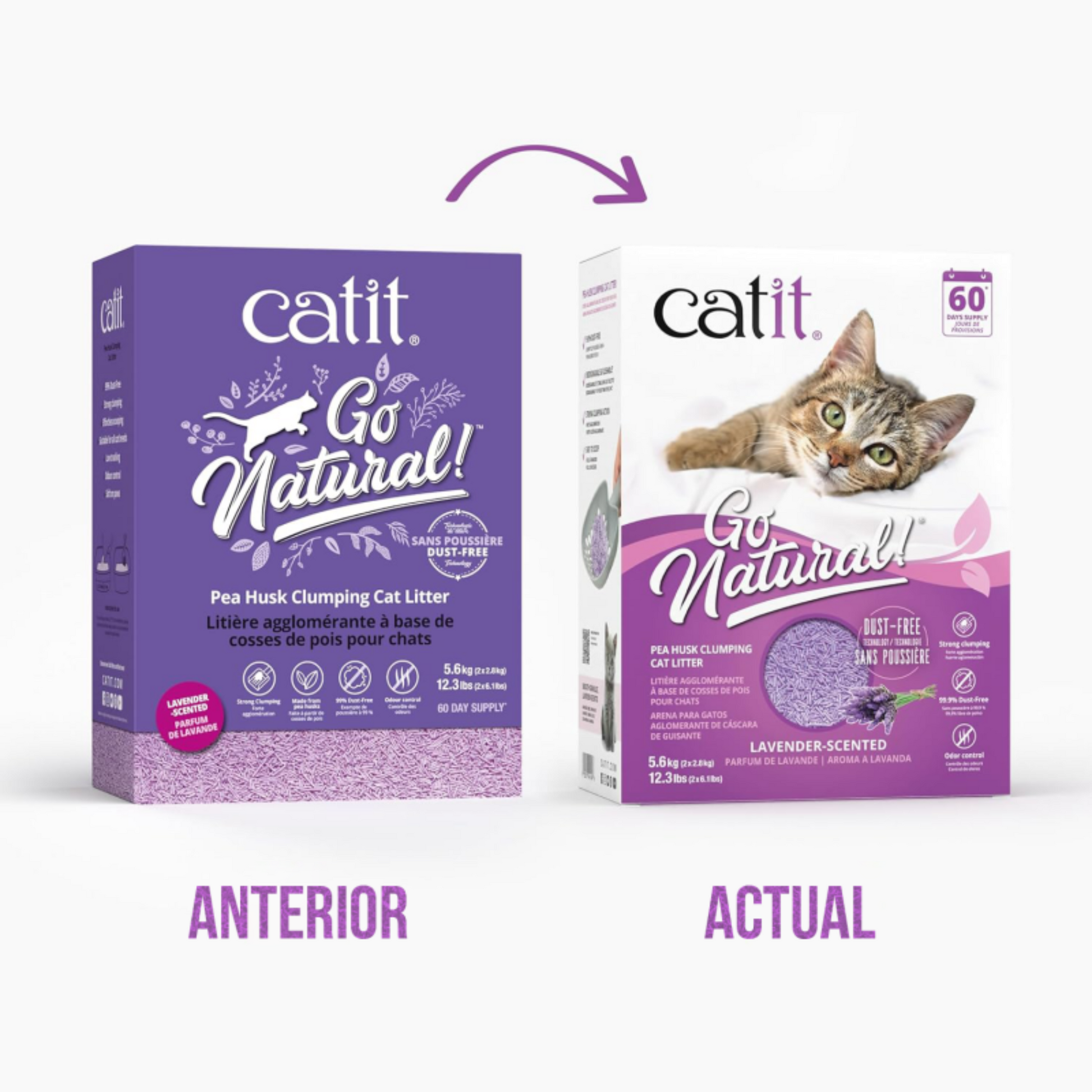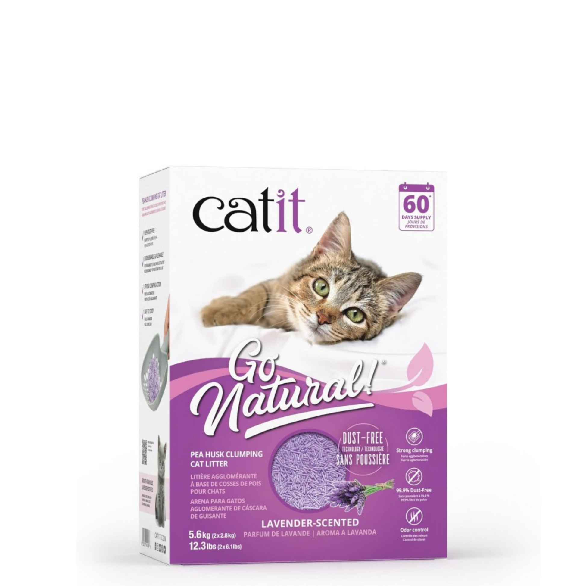 Areia Aglomerante de Cascas de Ervilhas recicladas Catit Go Natural com fragrância de lavanda ou baunilha.