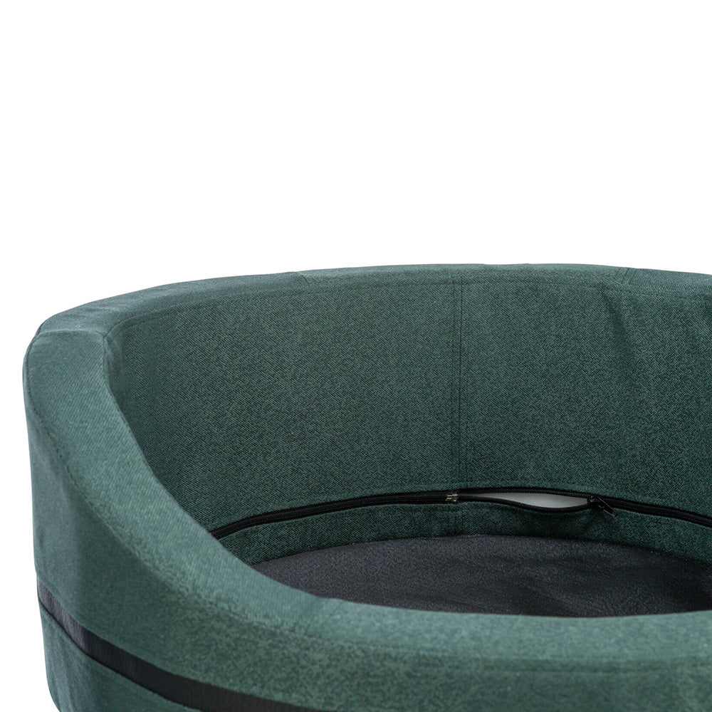 Cama oval com almofada removível e fundo anti derrapante.