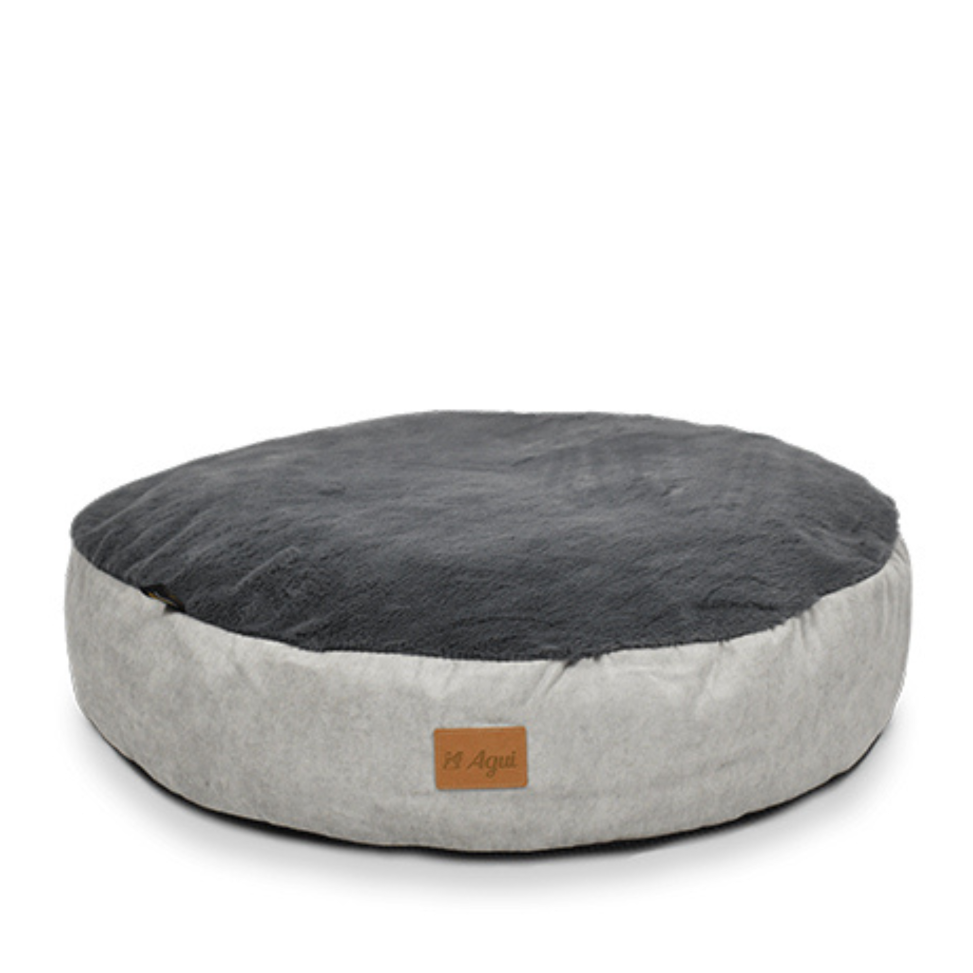 Cama puff redonda produzida com logotipo em pele. Topo forrado em pêlo macio. Enchimento interior em fibra macia.