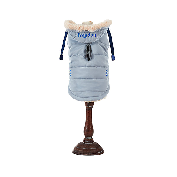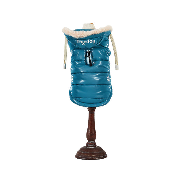 Casaco acolchoado e impermeável para cão, com capuz ajustável e rebordo em pelo sintético — perfeito para proteger o seu animal da chuva e do frio.