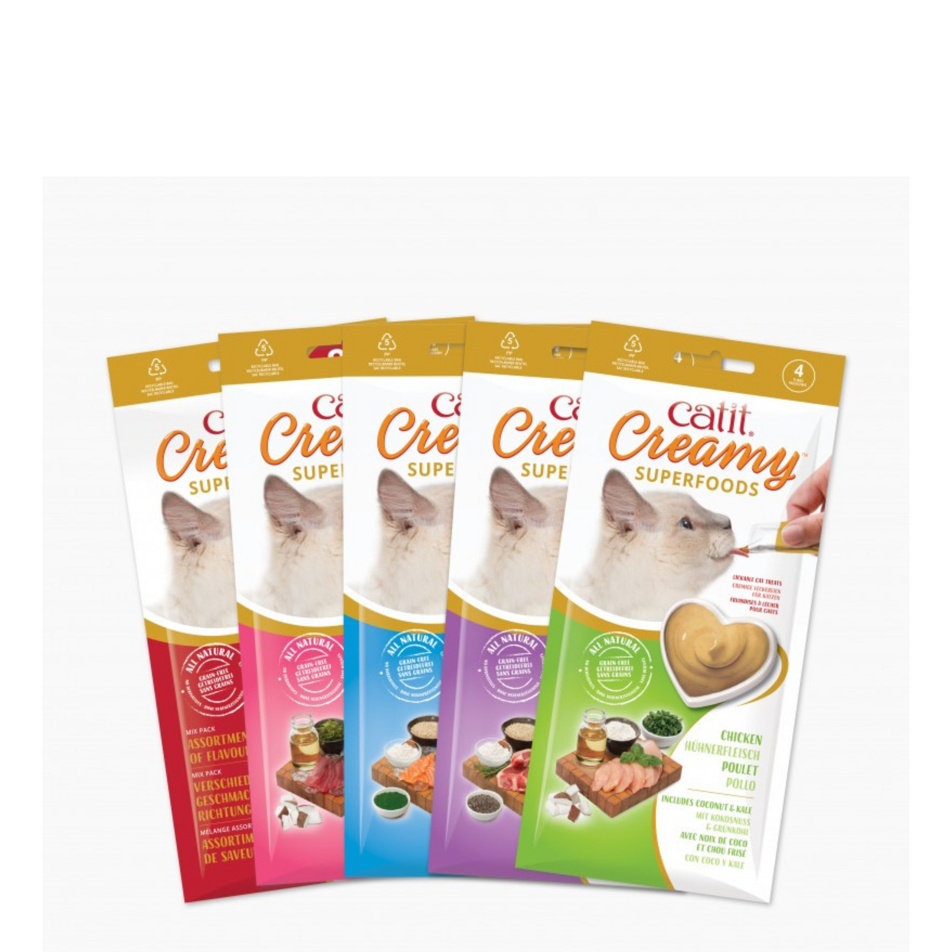 Catit Creamy com super alimentos é um snack muito nutritivo e saudável para gatos. Dos conhecidos Catit Creamy surgem os Catit Creamy Superfoods, que contém alimentos carregados de nutrientes como quinoa, chia, couve ou wakame.