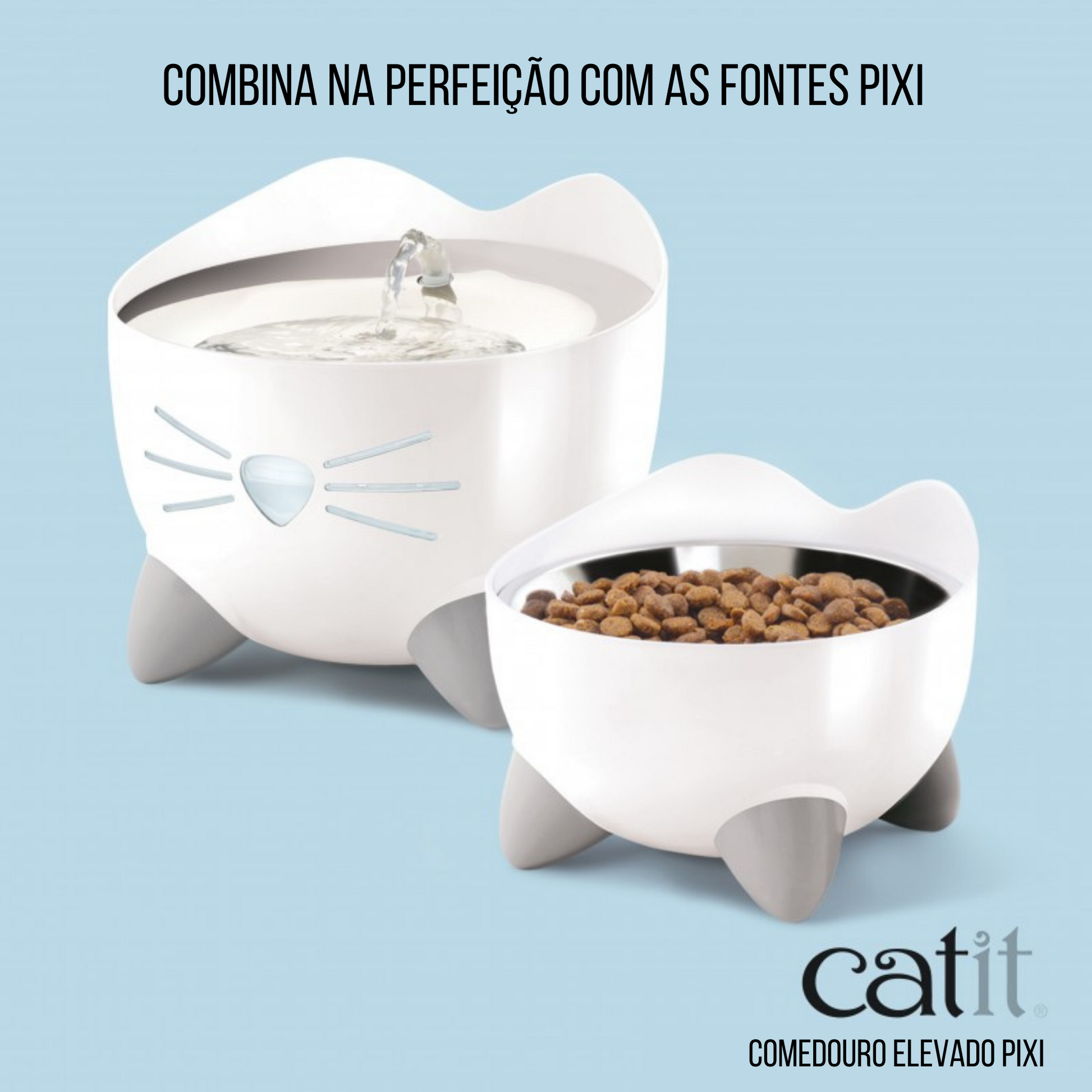 Um comedouro ergonômico para gatos que inclui 2 pratos de aço inoxidável que podem ser lavados na máquina de lavar louça. O adorável design felino da linha Catit PIXI torna-a mais um elemento de decoração para casa. Combina perfeitamente com as fontes Catit PIXI.