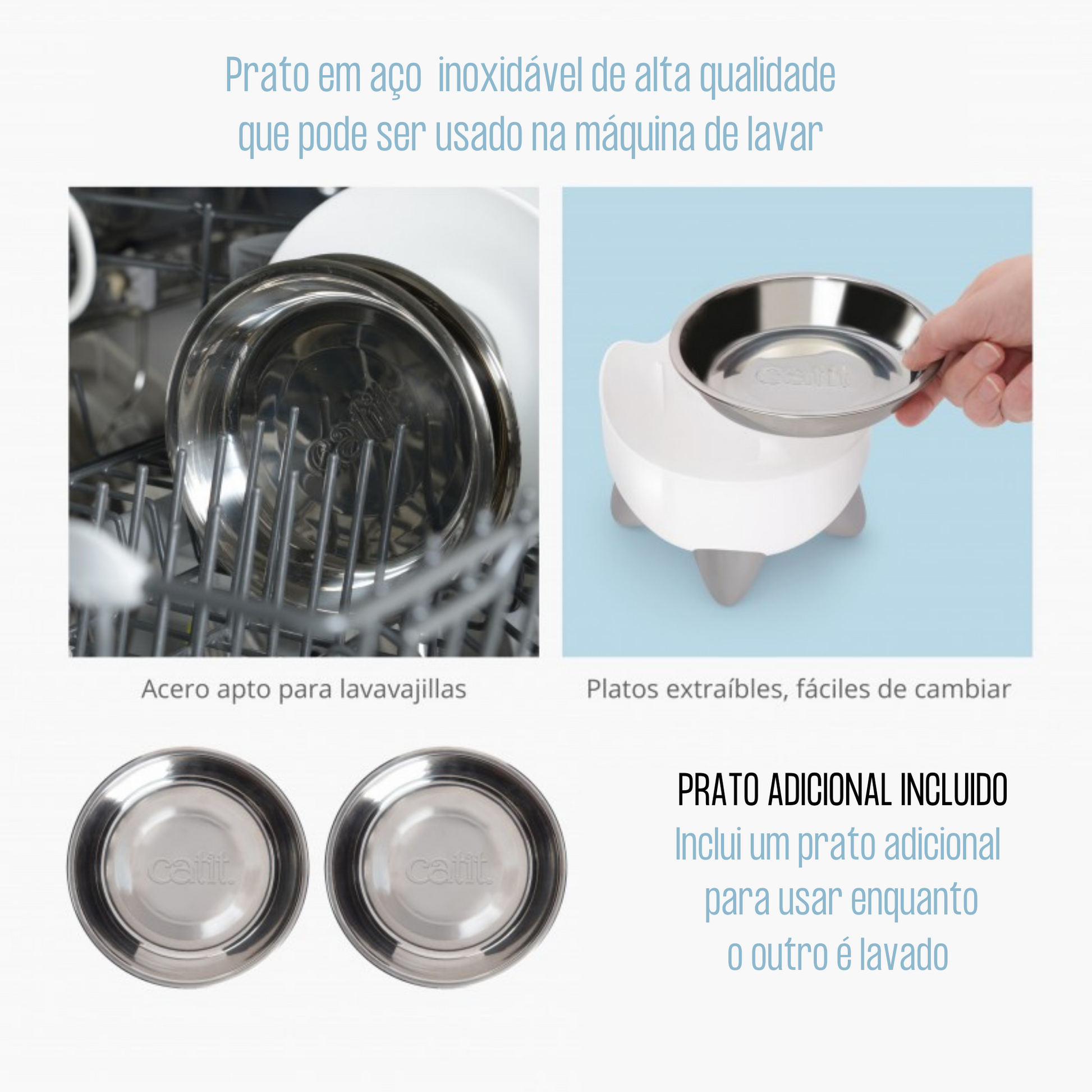 O Comedouro Elevado Catit PIXI é ideal para servir qualquer tipo de ração para gatos, ração seca ou Húmida, graças ao material de aço inoxidável dos pratos.