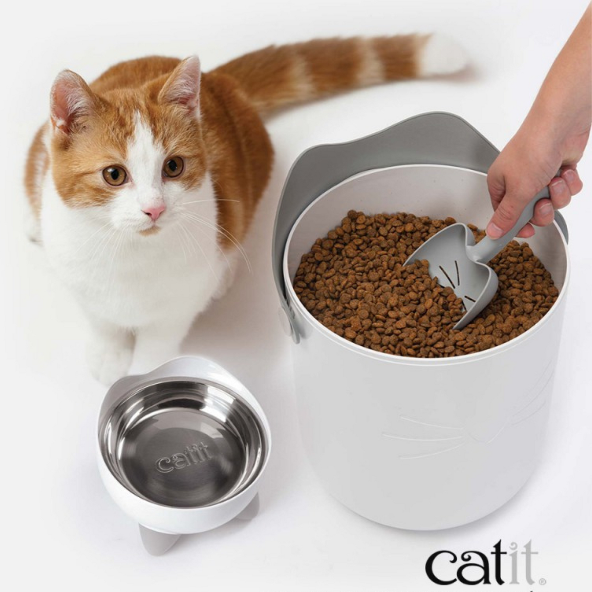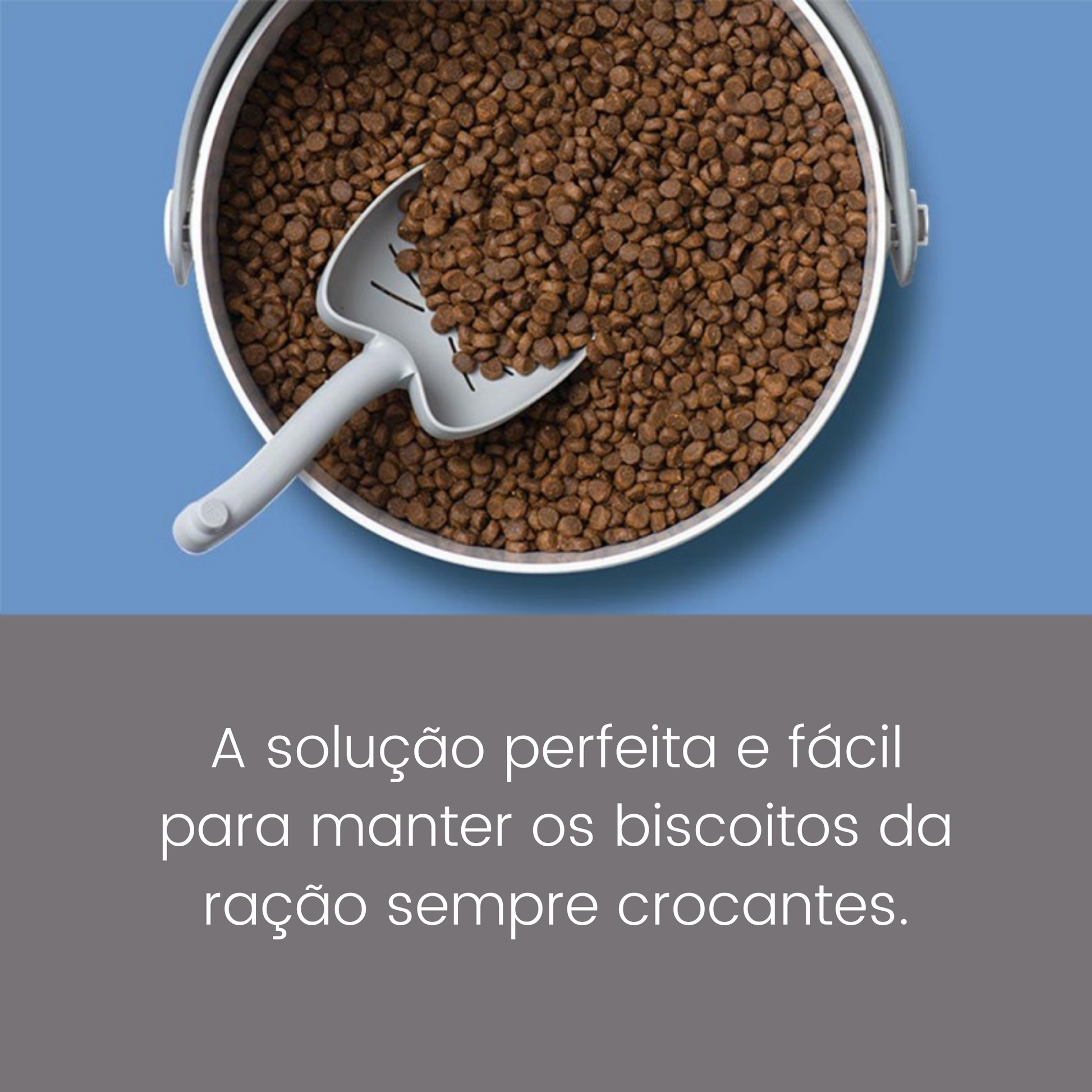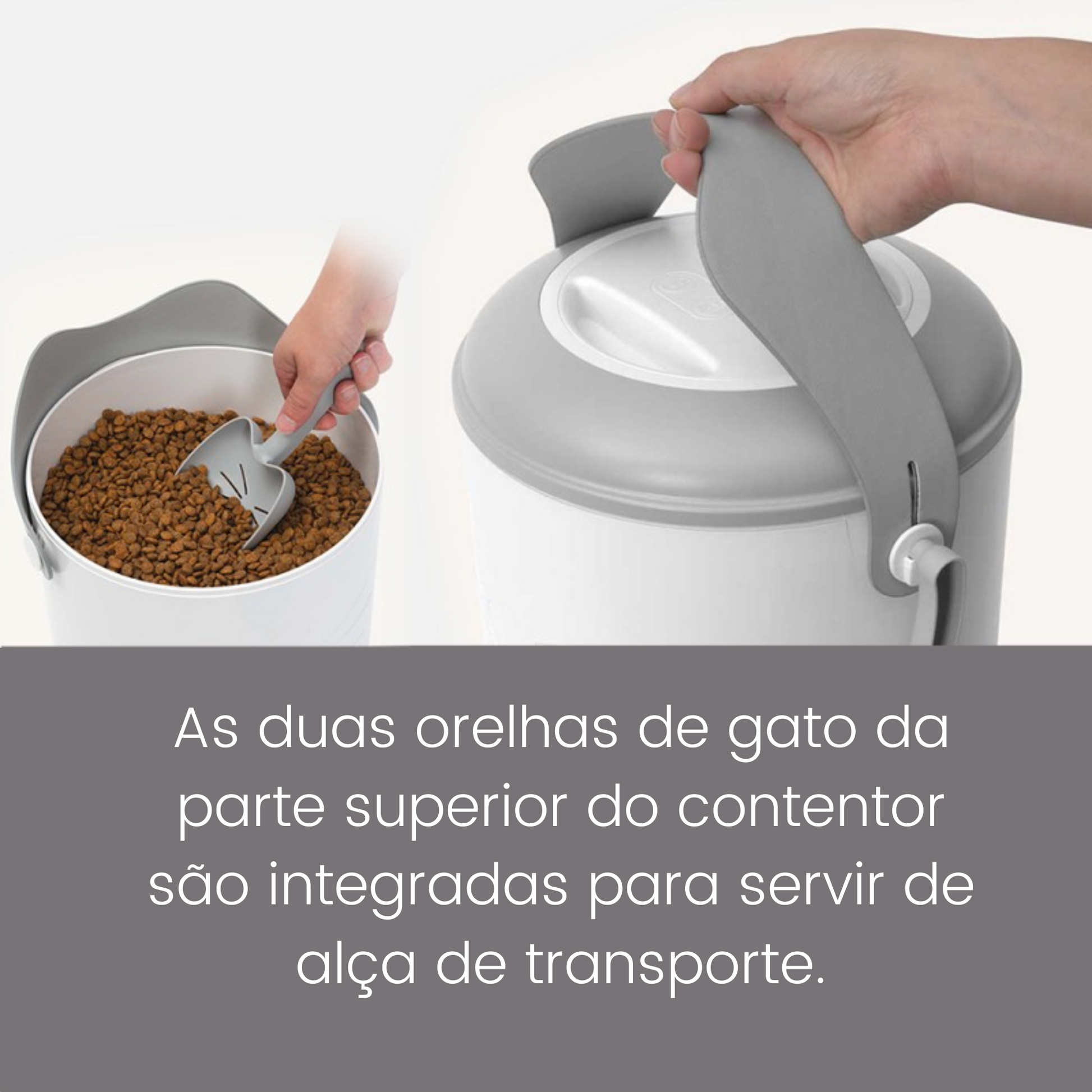 Prático recipiente para croquetes de ração para gatos de tamanho compacto ideal para fácil armazenamento no armário de qualquer cozinha ou despensa.