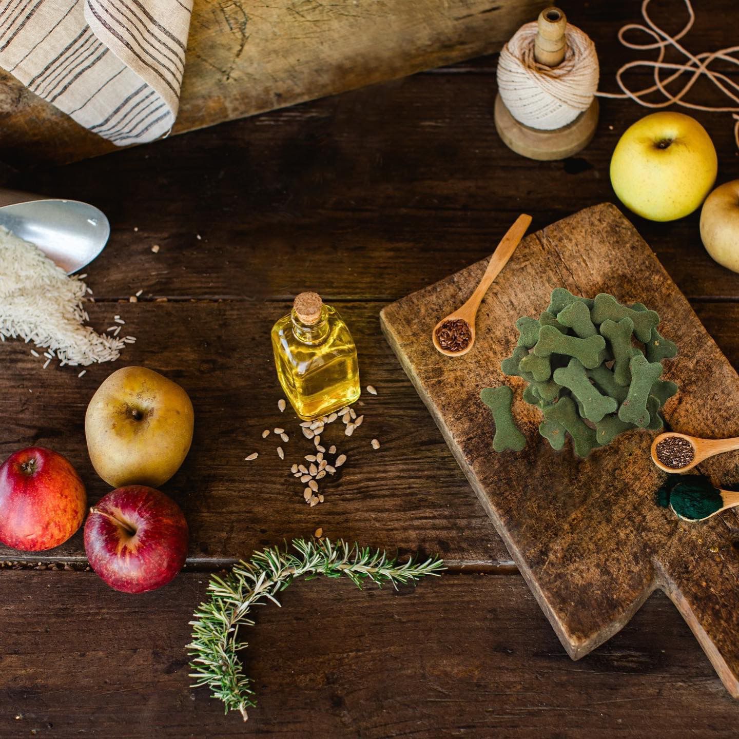 Composição: Farinha de arroz, maçã, sementes de linhaça, banha de porco, espirulina, semente de chia, extrato de alecrim.