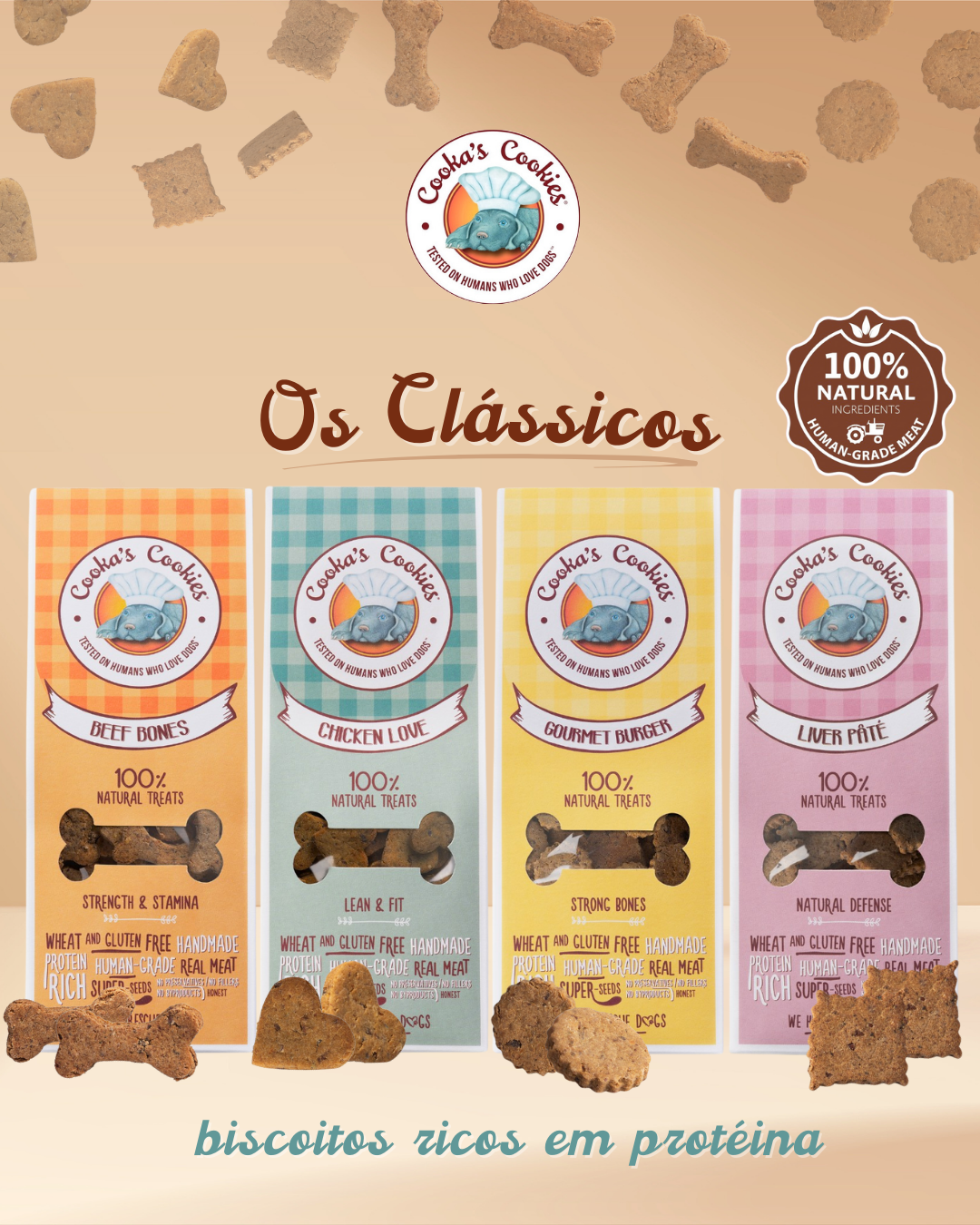 Todos os produtos da Cooka's Cookies são 100% naturais e próprios para consumo humano. "Somente se for bom o suficiente para nós é que é bom o suficiente para os nossos Patudos".