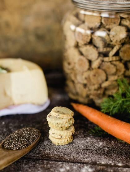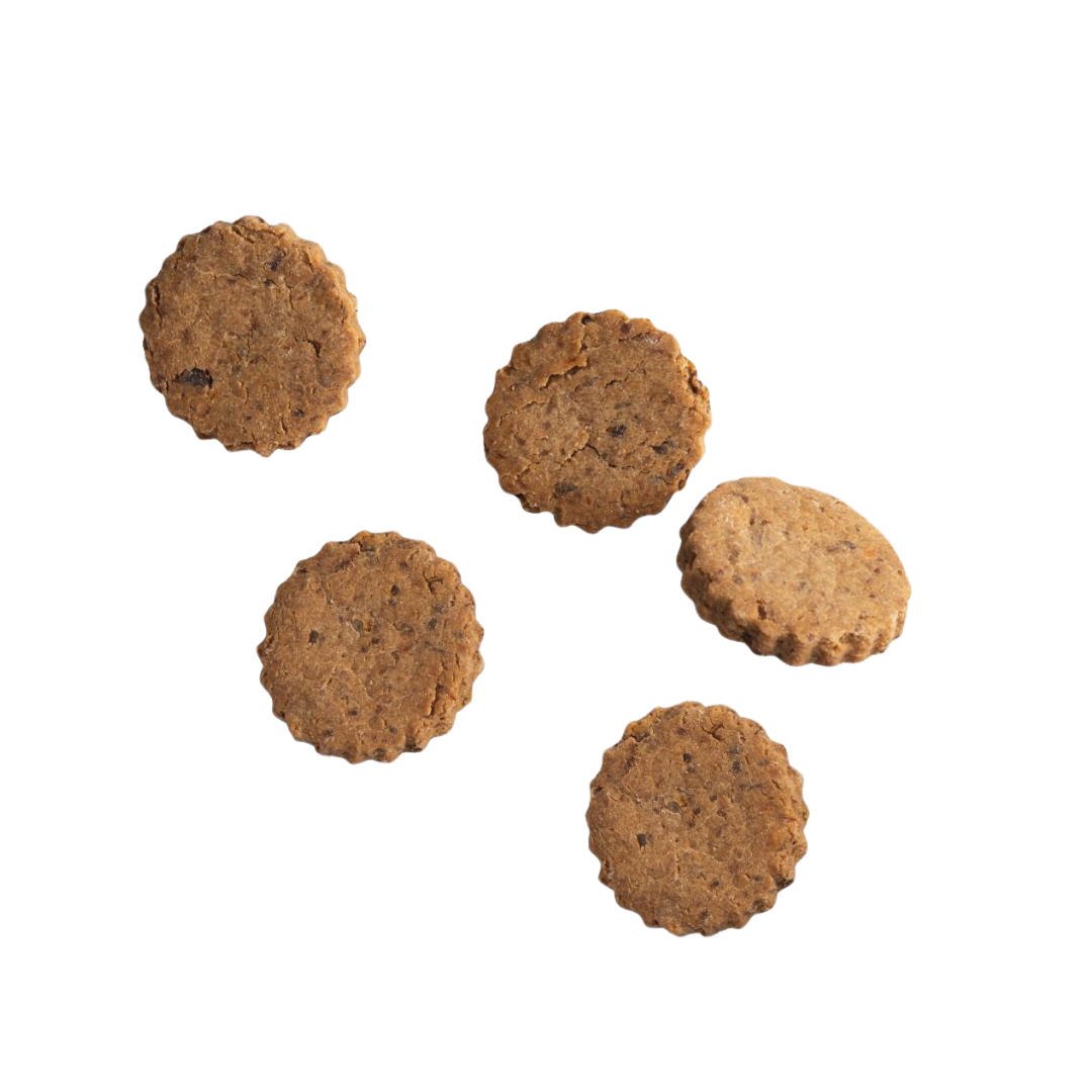 Composição: Farinha de arroz, carne de porco fresca - músculo, fígado, rim (27%), cenoura, maçã, queijo, banha de porco, sementes de linhaça, semente de chia, salsa, extrato de alecrim.