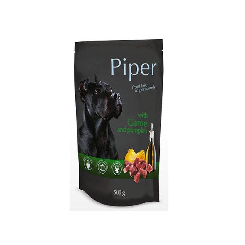 Piper de caça e abóbora, para cão adulto, é um alimento em patê, muito saboroso e nutritivo para o cão. Contém lisina, leucina, vitaminas do grupo B e selénio. A adição de óleo de linhaça promove um equilíbrio entre os ácidos gordos polinsaturados, do grupo n-3 e n-6, que garante a manutenção do nível correto de processos anti-inflamatórios. A adição de abóbora fornece energia providenciando nutrientes necessários para o controle dos processos de metabolização de proteínas e gorduras. Este alimento também contém carboidratos compostos por fibras diatéticas que influenciam a regulação dos processos digestivos e estimulam o trânsito intestinal.
