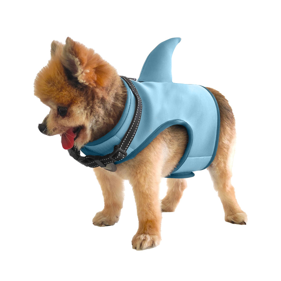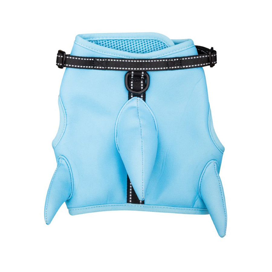 Peitoral para cães em forma de tubarão feito de neoprene macio e malha respirável no interior. Bastante fresco para o verão.