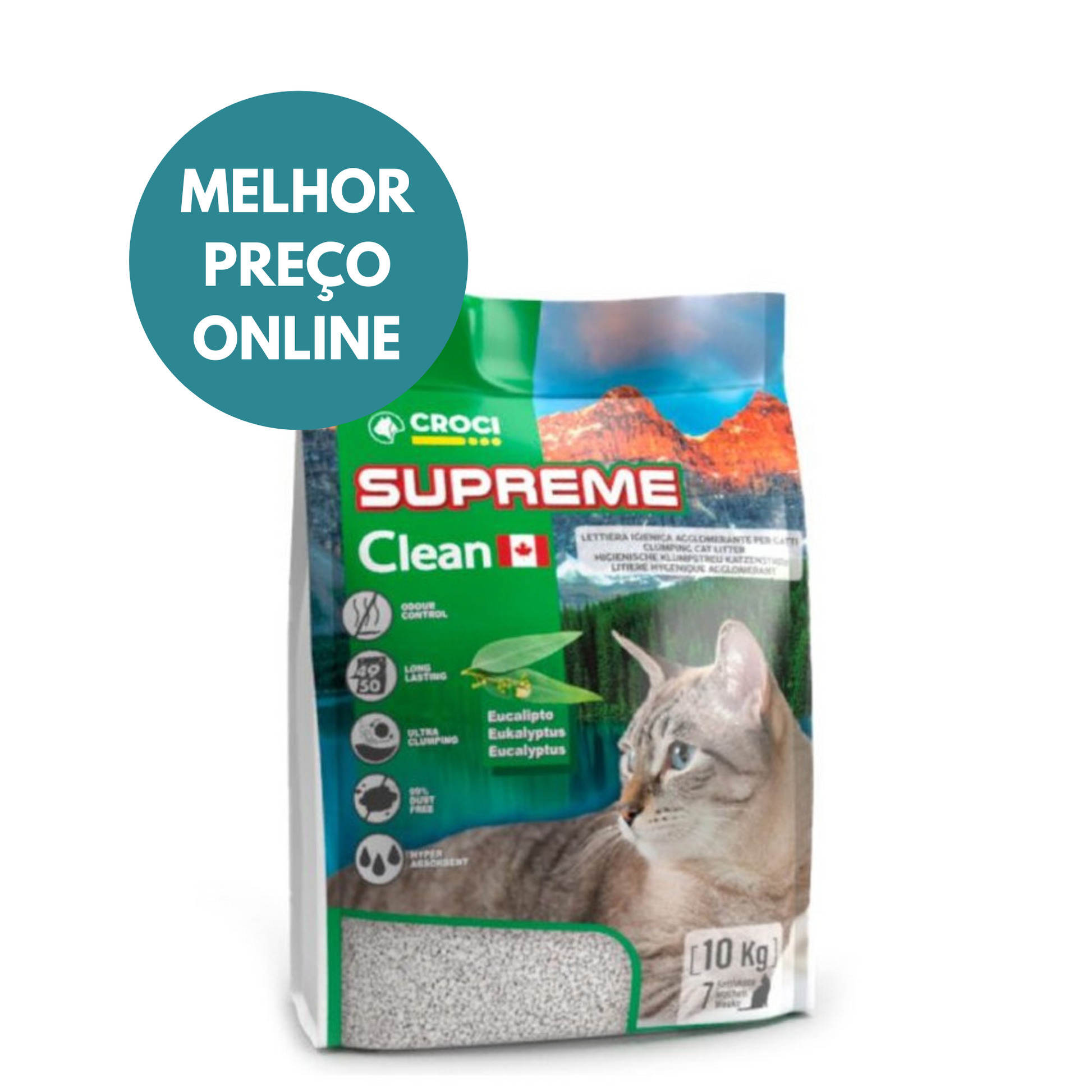A areia para gatos Supreme Clean da Croci é composta por 100% granulado de argila natural de origem canadiana, livre de aditivos químicos e com alta capacidade de aglomeração e absorção.