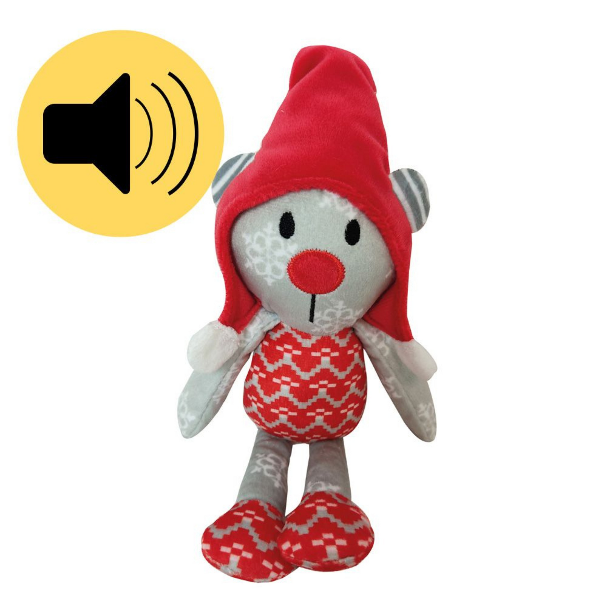 Este brinquedo é feito inteiramente em pelúcia macia e enriquecido com detalhes como um chapéu e um grande nariz vermelho que o tornam fofo e em perfeito espírito natalício.