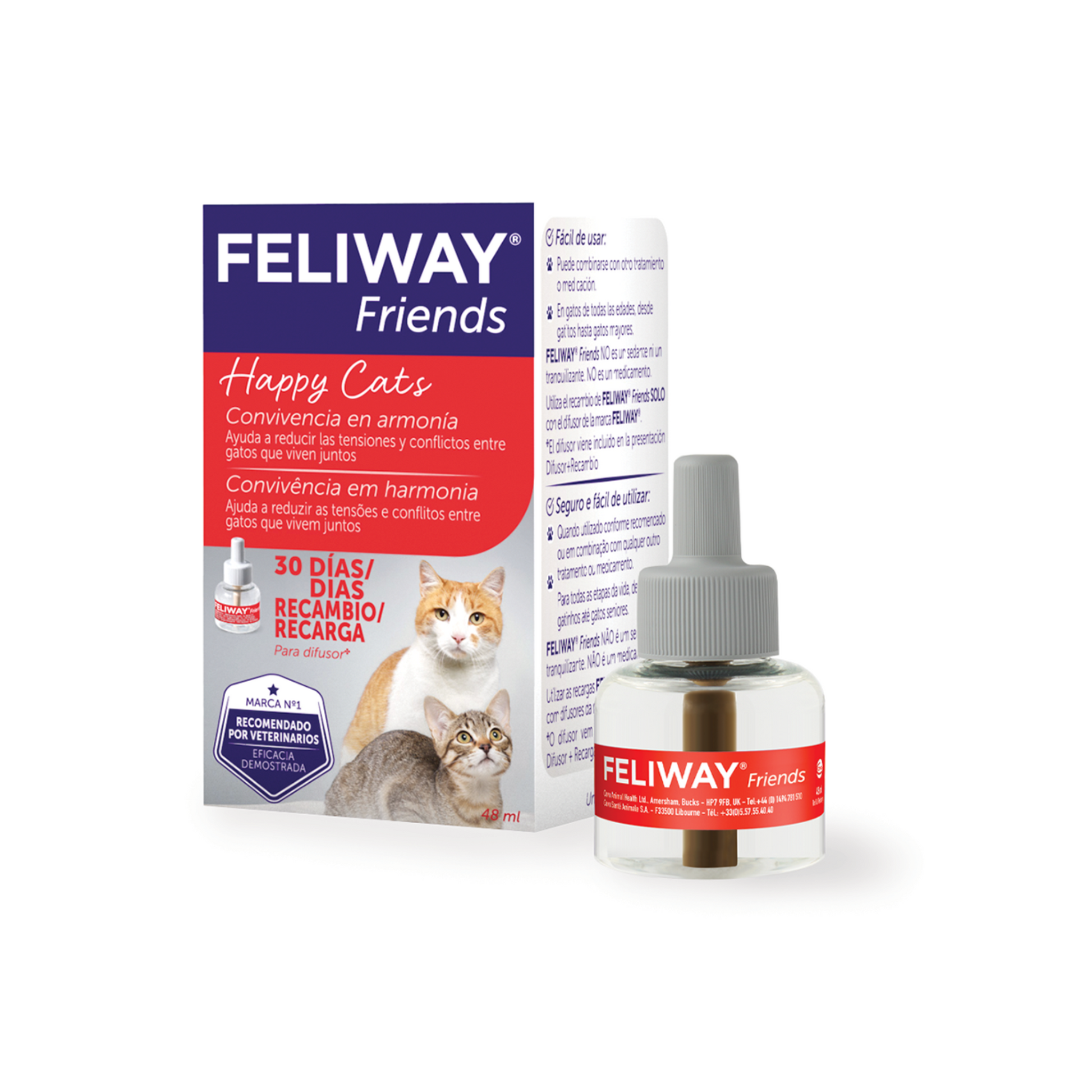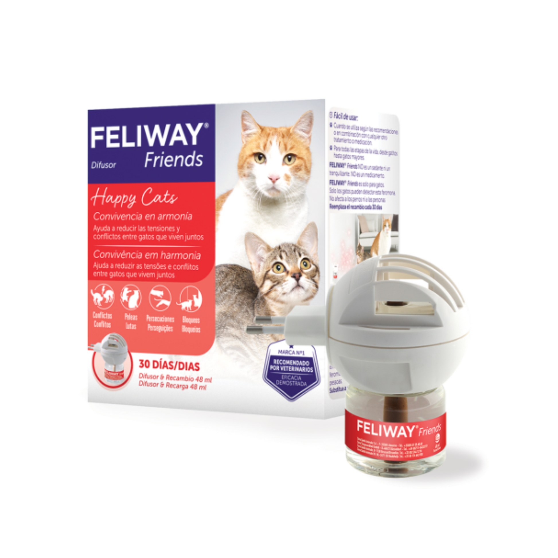 FELIWAY FRIENDS é uma solução fácil de usar para ajudar a reduzir o conflito entre gatos que vivem juntos, e evitar sinais como agressões, perseguições, bloqueios e confrontos visuais.