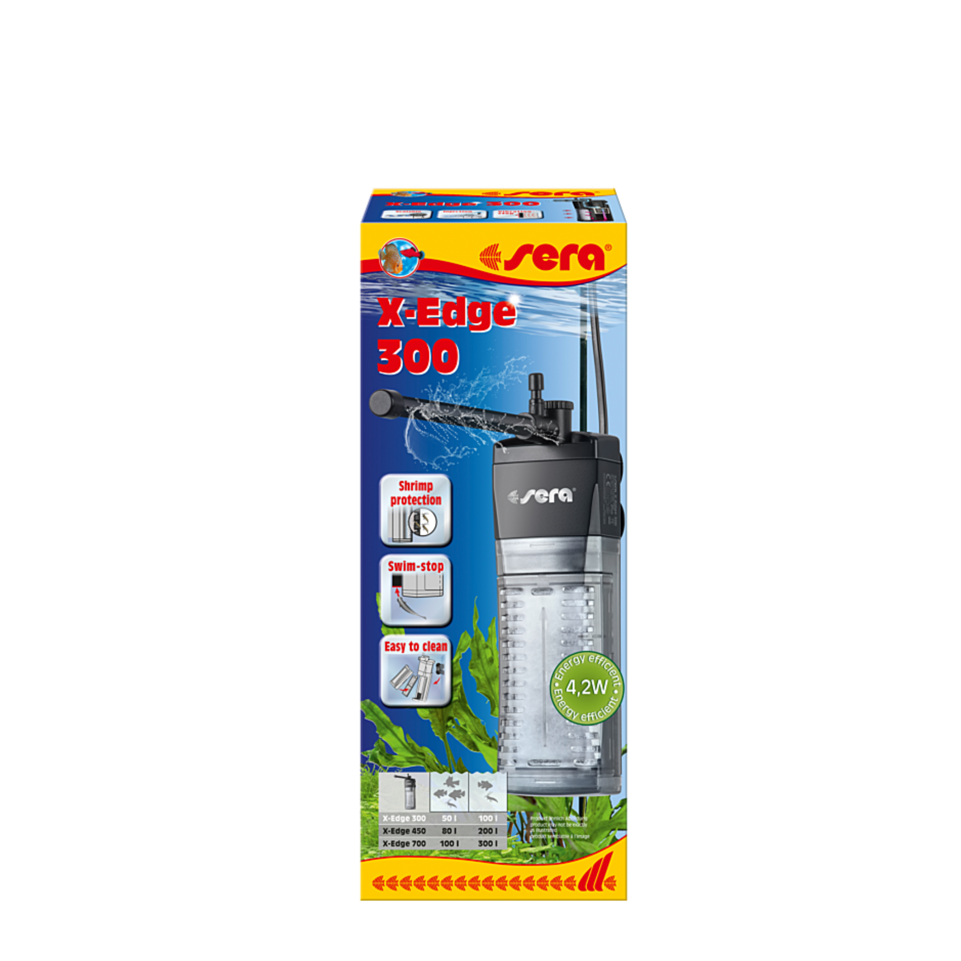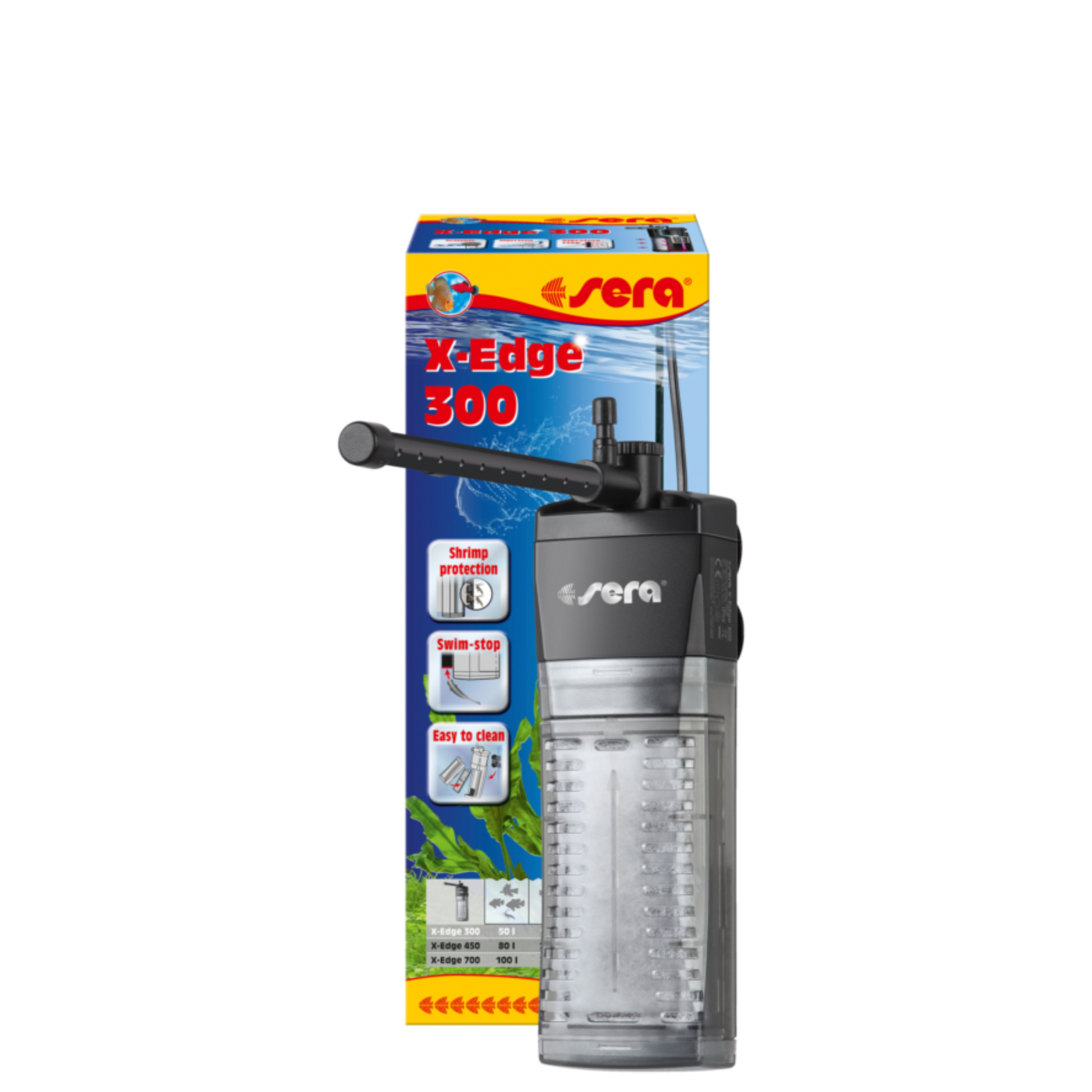 Como em todos os filtros de sera, a questão da segurança, naturalmente, também foi tida em consideração na conceção dos filtros de canto sera X-Edge. Em determinadas circunstâncias, os filtros de canto podem ser perigosos para os peixes e camarões. Há que ter em conta dois aspetos: Por um lado, os peixes às vezes nadam atrás do filtro de canto, correndo o risco de ficarem presos. Por este motivo, foi integrado o “Swim-stop” que evita que os peixes nadem atrás do filtro de canto. Por outro lado, os camarões jovens, em particular, frequentemente entram para o filtro, através dos materiais filtrantes, o que, como é óbvio, pode ser perigoso para os animais. Para evitar isso, foram utilizados materiais filtrantes que encaixam perfeitamente.