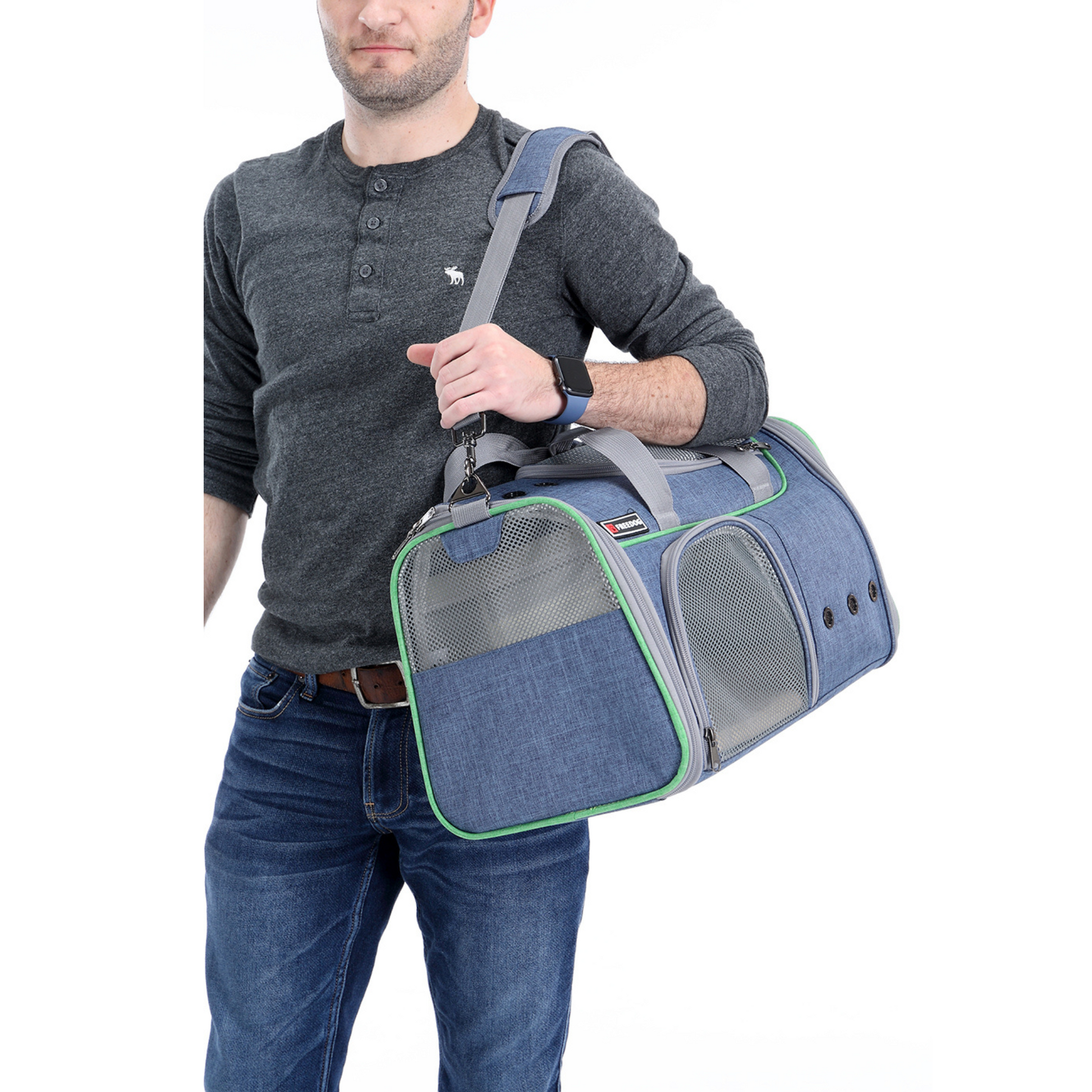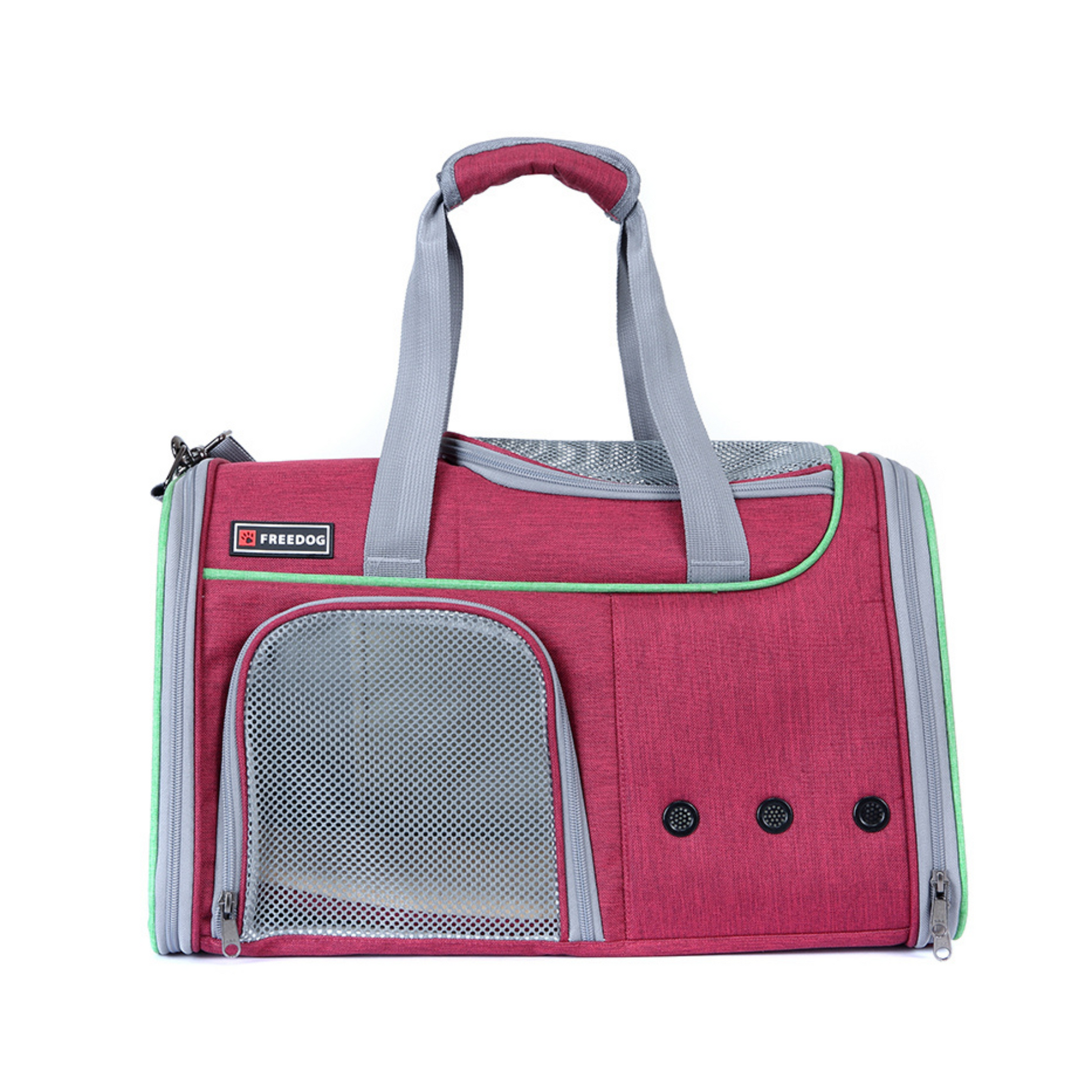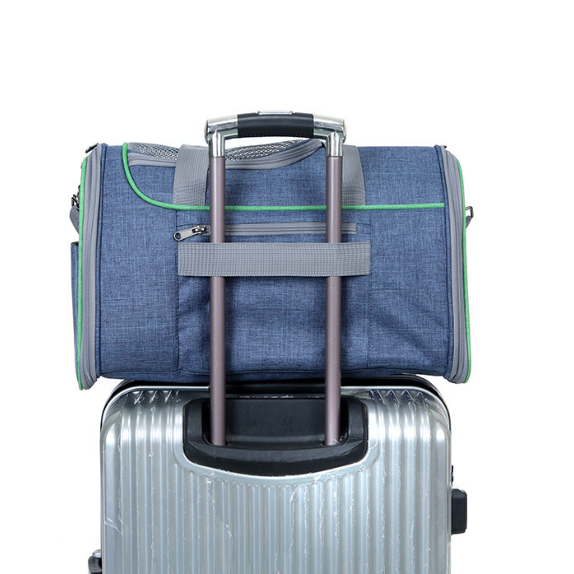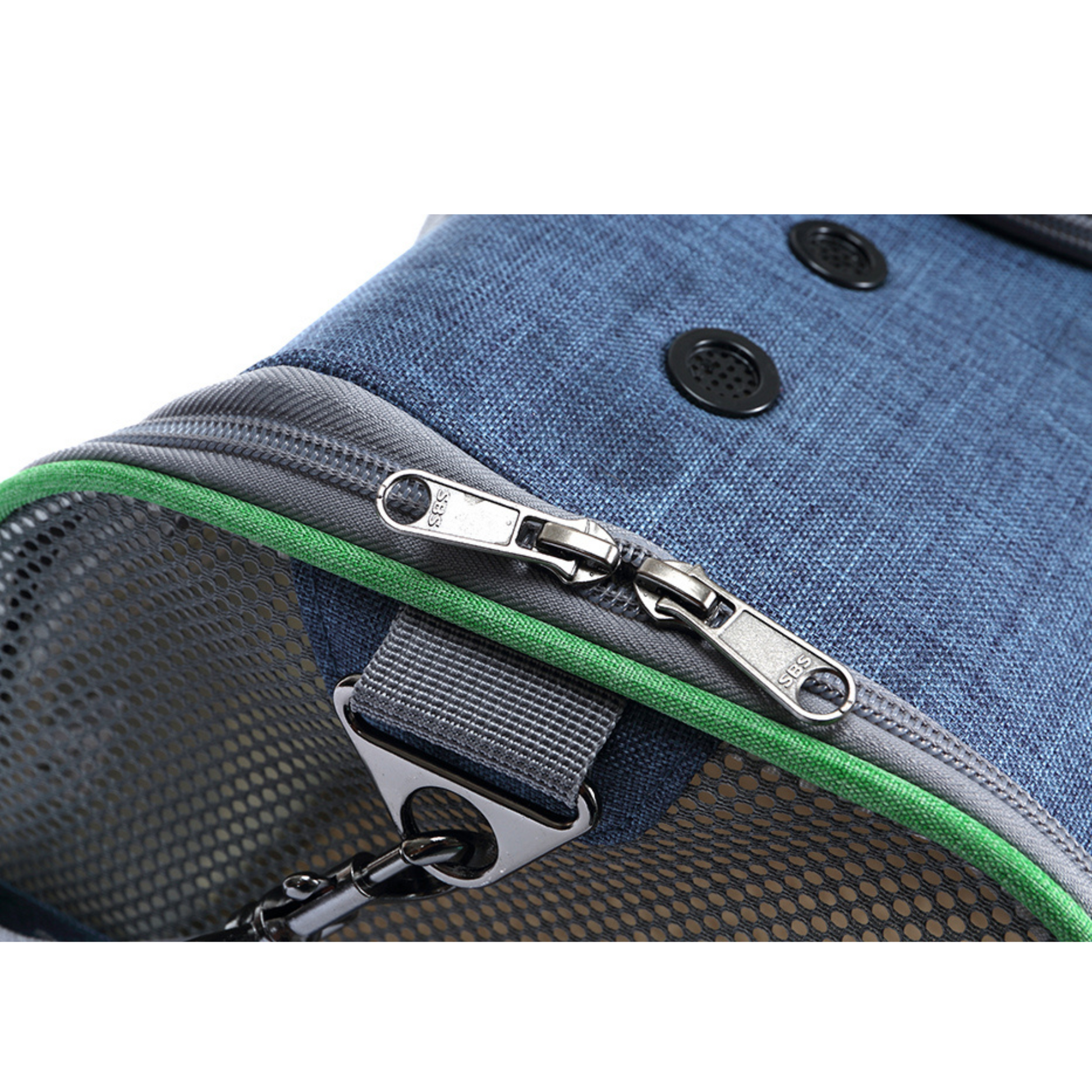 Possui coleira para facilitar o transporte e zíper na parte superior para facilitar o acesso do seu patudo. A parte superior é feita de lona tipo rede para uma boa ventilação. Também inclui um protetor transparente para dias chuvosos.