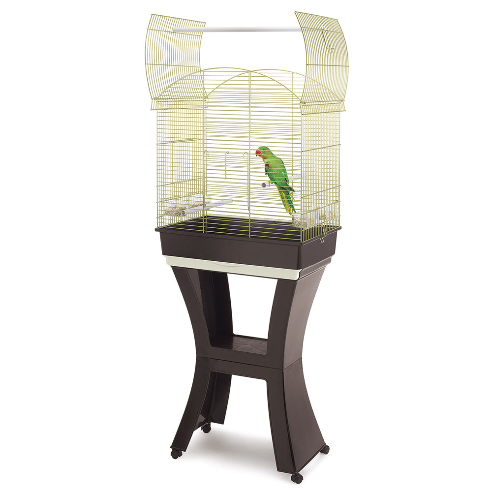 Gaiola para periquitos grandes e caturras, equipada com um suporte de rodas giratórias para movê-la confortavelmente de um lugar para outro.