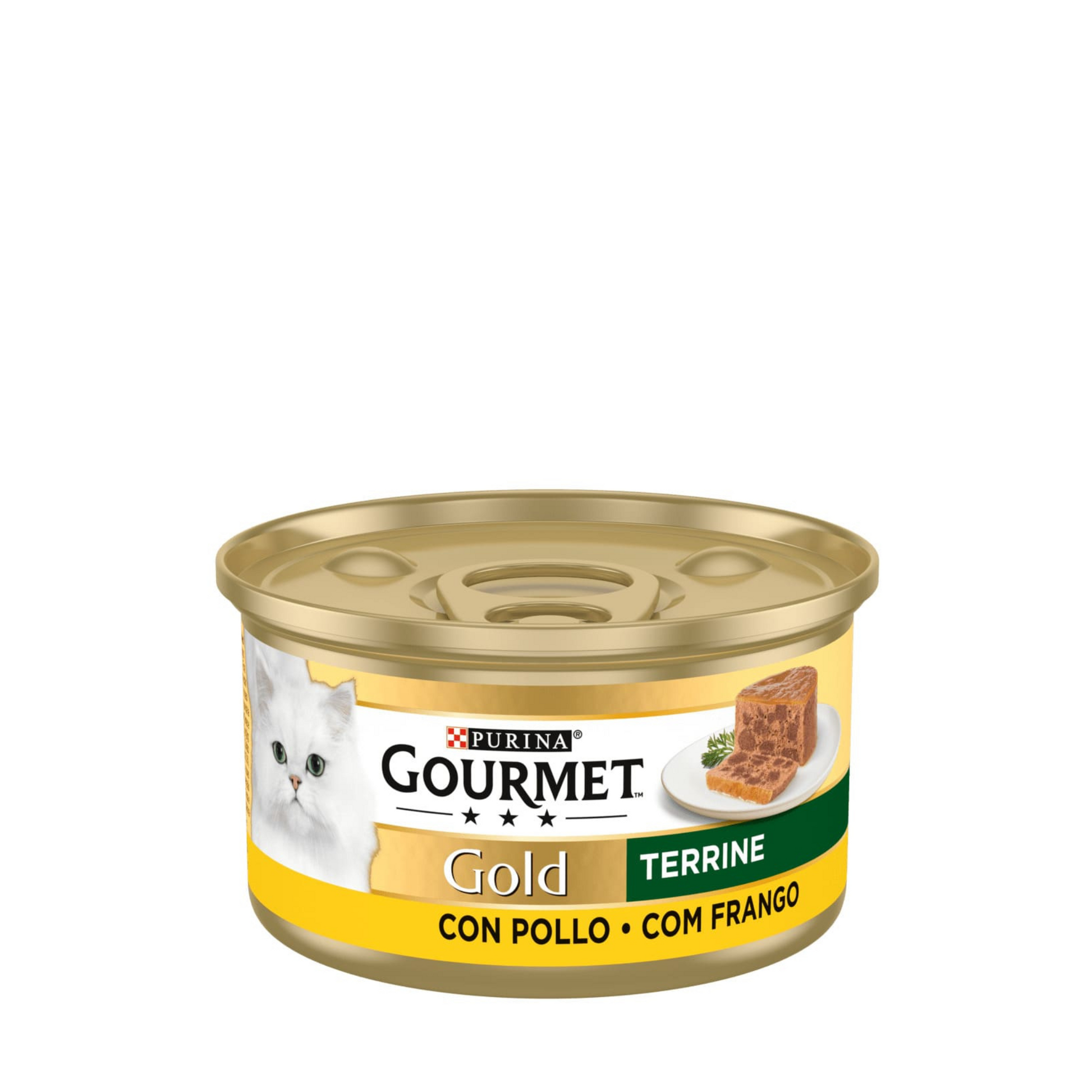 GOURMET Gold Terrine é um saboroso patê com delicados pedaços, cuidadosamente cortados com frango, salmão e outros ingredientes selecionados para oferecer ao seu gato uma apetitosa combinação de texturas.Todas as receitas de GOURMET Gold são elaboradas com ingredientes de elevada qualidade e sem adição de corantes, sem adição de aromatizantes artificiais e sem adição de conservantes artificiais.
