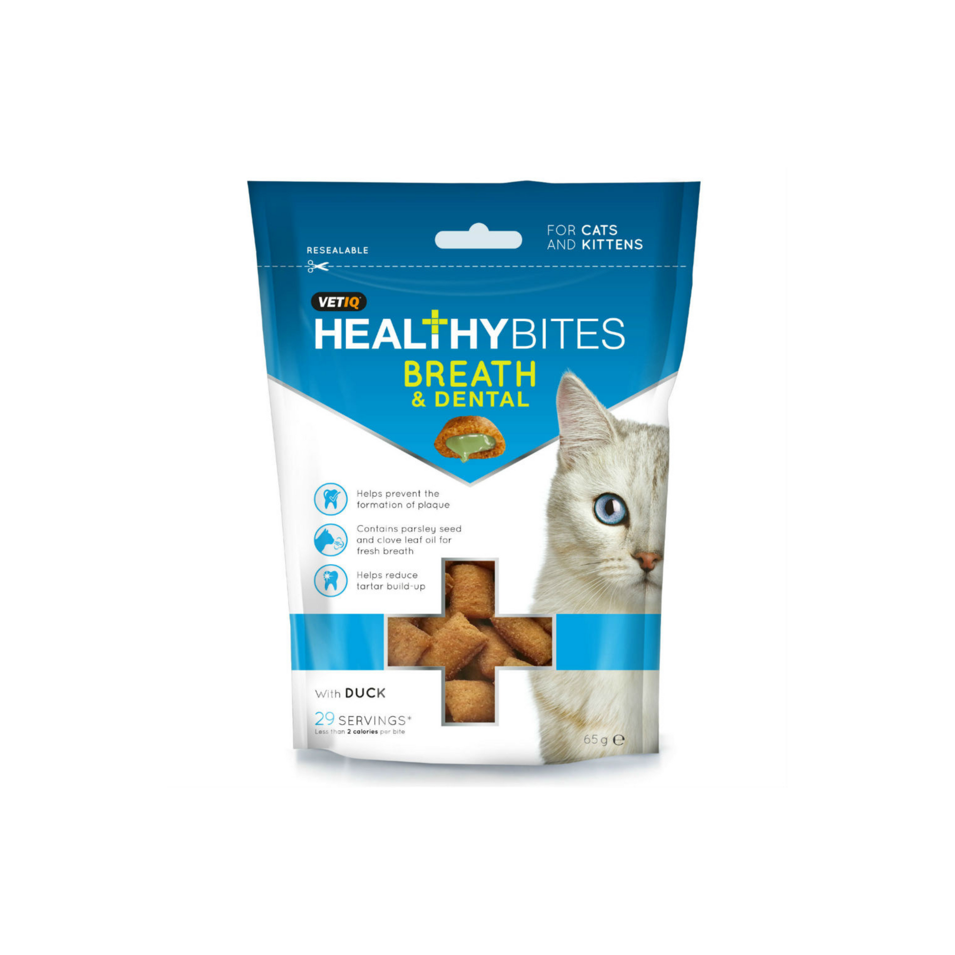 Healthy Bites Breath & Dental para gatos e gatinhos são snacks deliciosos de ação dupla formulados para incluir uma casca externa seca que massaja as gengivas e raspa a superfície do dente e um centro cheio de creme para melhorar a saúde contendo antibacteriano natural, antimicrobiano e ingredientes para refrescar o hálito. Aprovados por veterinários, não têm corantes, sabores ou conservantes artificiais e também são livres de trigo!
