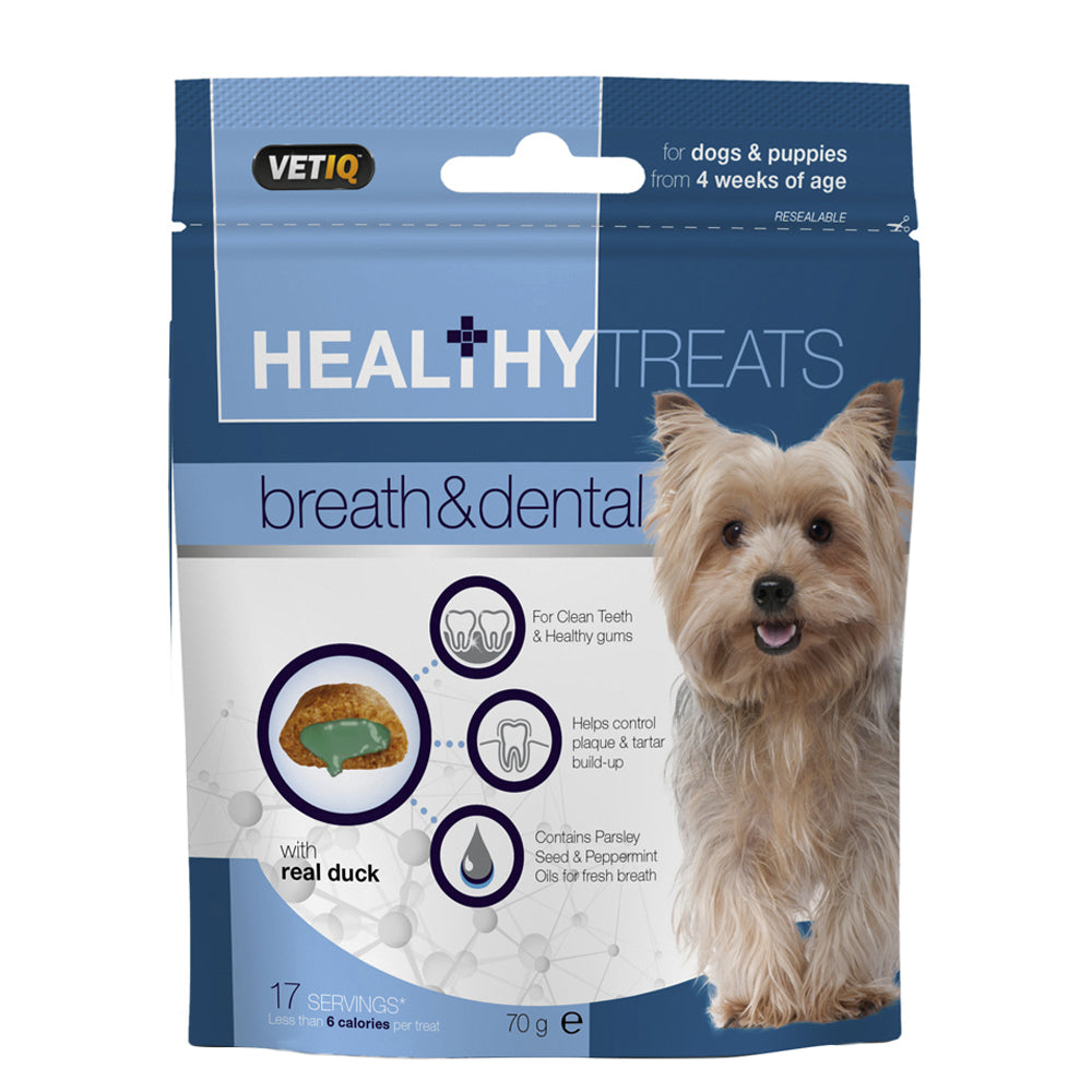 Healthy Treats Breath & Dental foram formulados por nutricionistas animais para promover o bem-estar de seus animais de estimação. Cada snack é composto por uma deliciosa casca de cereal crocante com um recheio de creme para melhorar a saúde. Healthy Treats Breath & Dental para cães adultos e cachorrinhos elimina a necessidade de escovar enquanto garante que o seu animal de estimação mantém os dentes e gengivas saudáveis.