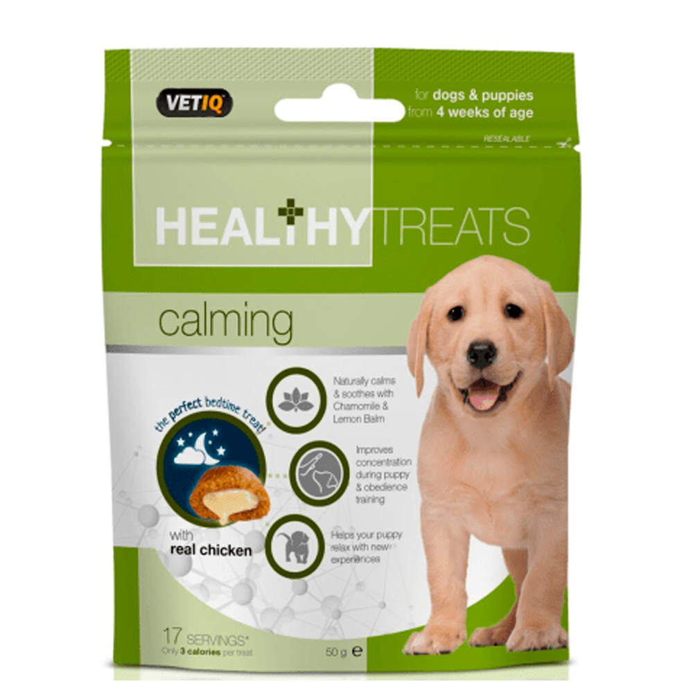 Healthy Treats Calming ajuda a reduzir a ansiedade durante situações stressantes, como uma nova casa, treino, viagem, higiene, ficar em canis, banhos e tosquias, ficar sozinho em casa, uma ida ao veterinário, fogos de artifício ou barulhos altos.