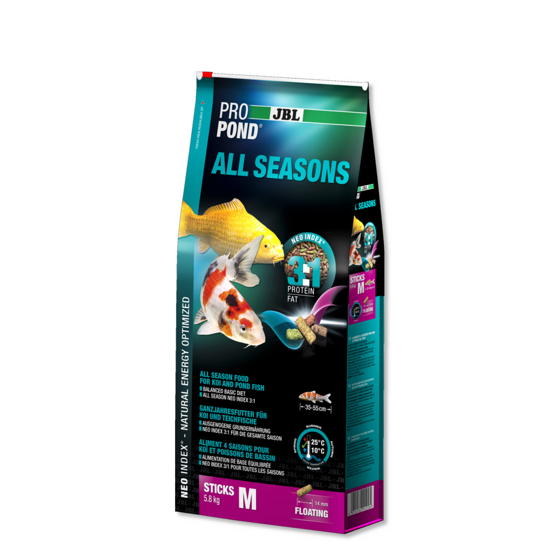 - Com trigo, salmão, camarões, espinafre e espirulina para peixes de lago de jardim fortes e saudáveis (com uma temperatura da água de 10-25 °C)