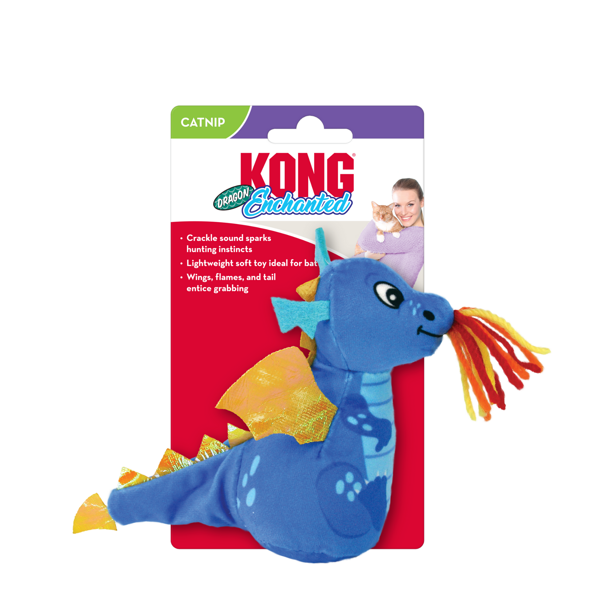 O KONG Enchanted Dragon convida os gatos a uma aventura mágica de brincadeira! O som crepitante desperta o instinto de caça, incentivando o gato a dar patadas neste brinquedo leve e macio. As asas, chamas e cauda são irresistíveis para agarrar, enquanto a erva-gateira KONG Premium North American Catnip prolonga o interesse. As diferentes texturas tornam cada sessão de brincadeira ainda mais envolvente.