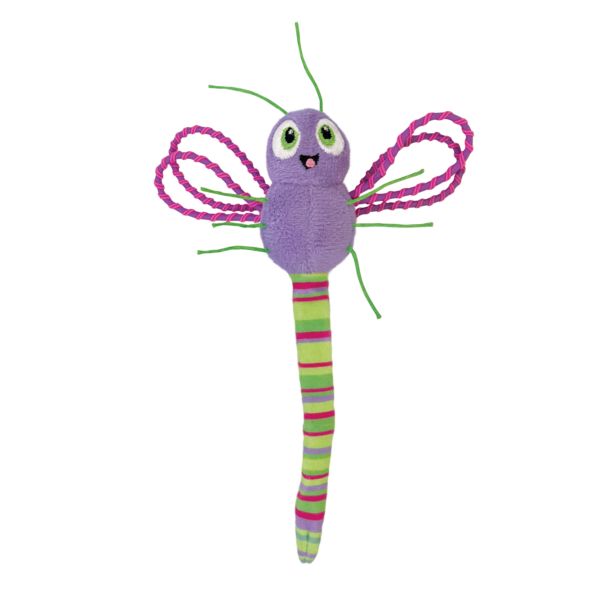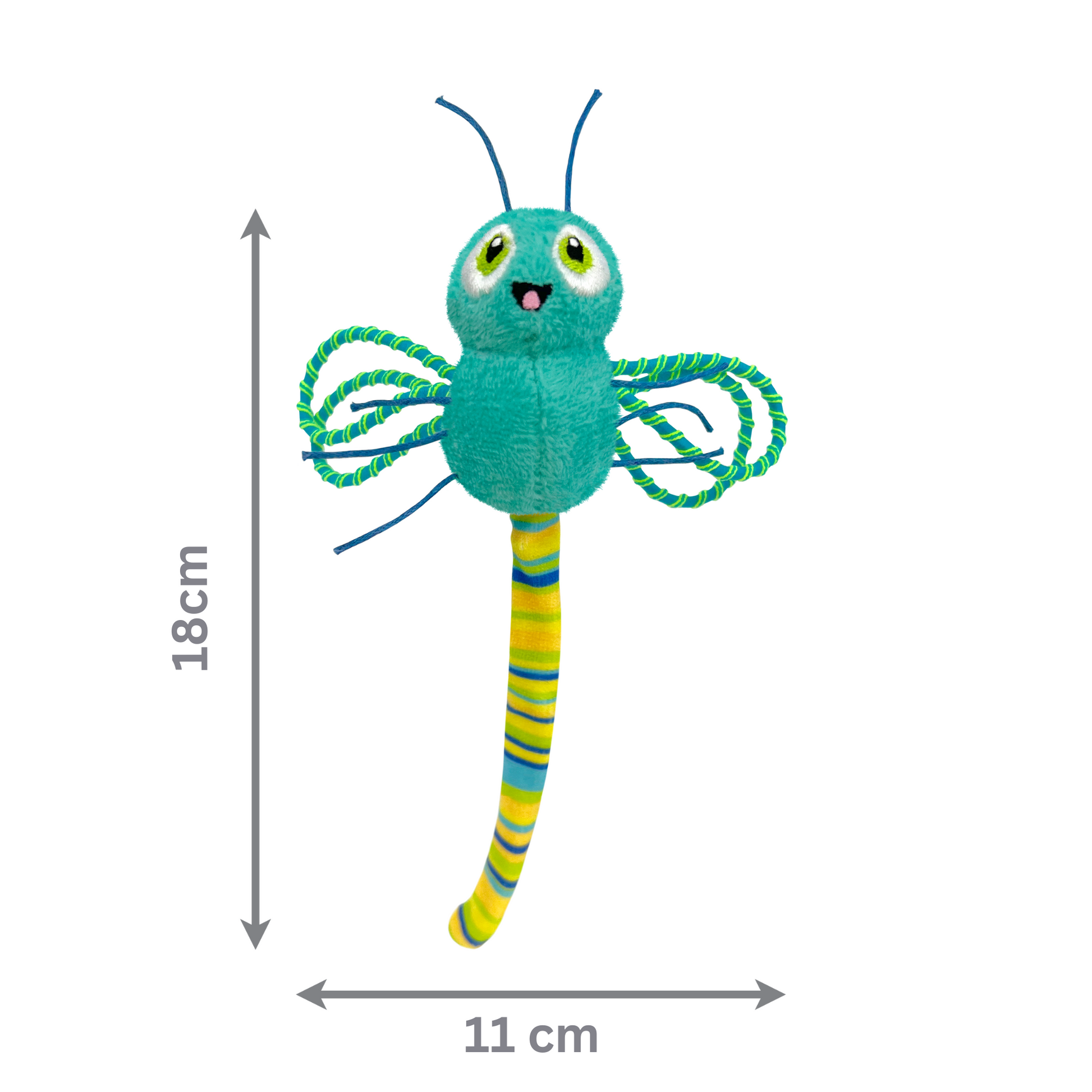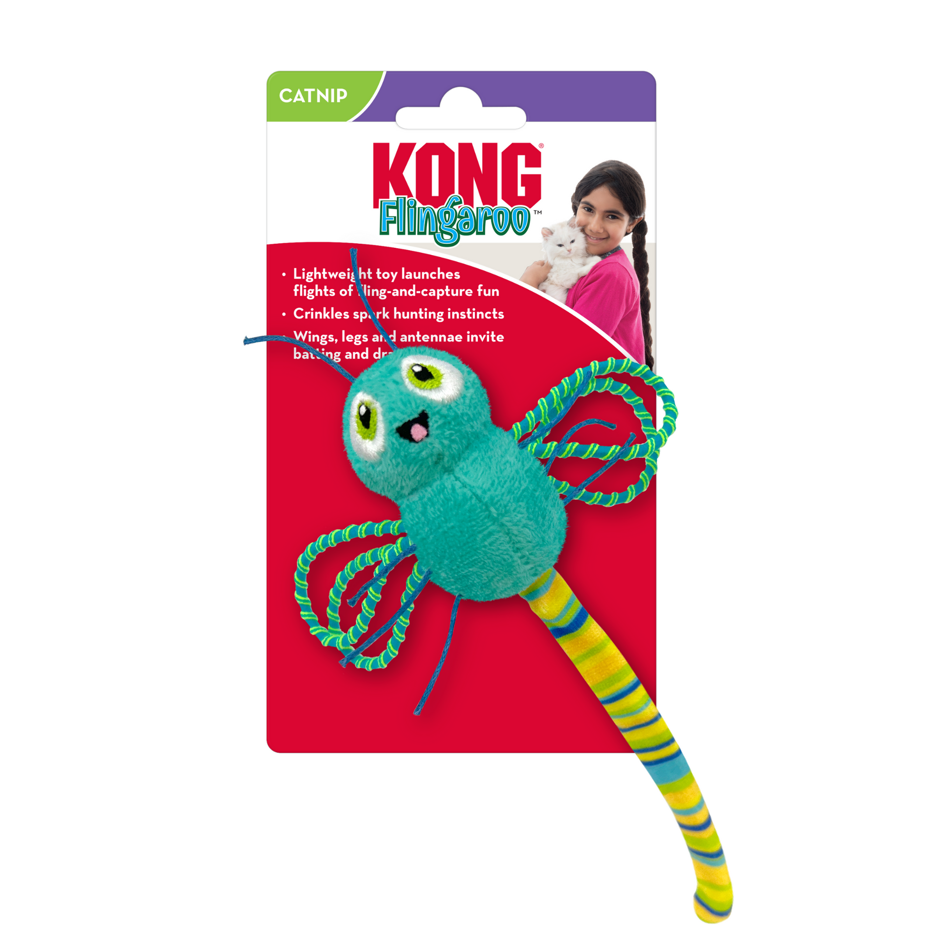 O KONG Flingaroo Dragonfly é um brinquedo interativo que estimula os instintos naturais do gato através de "voos" leves e divertidos. Com asas elásticas que promovem arremessos de longa distância, este brinquedo é ideal para sessões de brincadeira energéticas e saudáveis. O corpo leve e enrugado, combinado com pernas e antenas apelativas, convida o gato a saltar, agarrar, arrastar e explorar. Contém erva-gateira KONG Premium North American Catnip para manter o interesse por mais tempo.