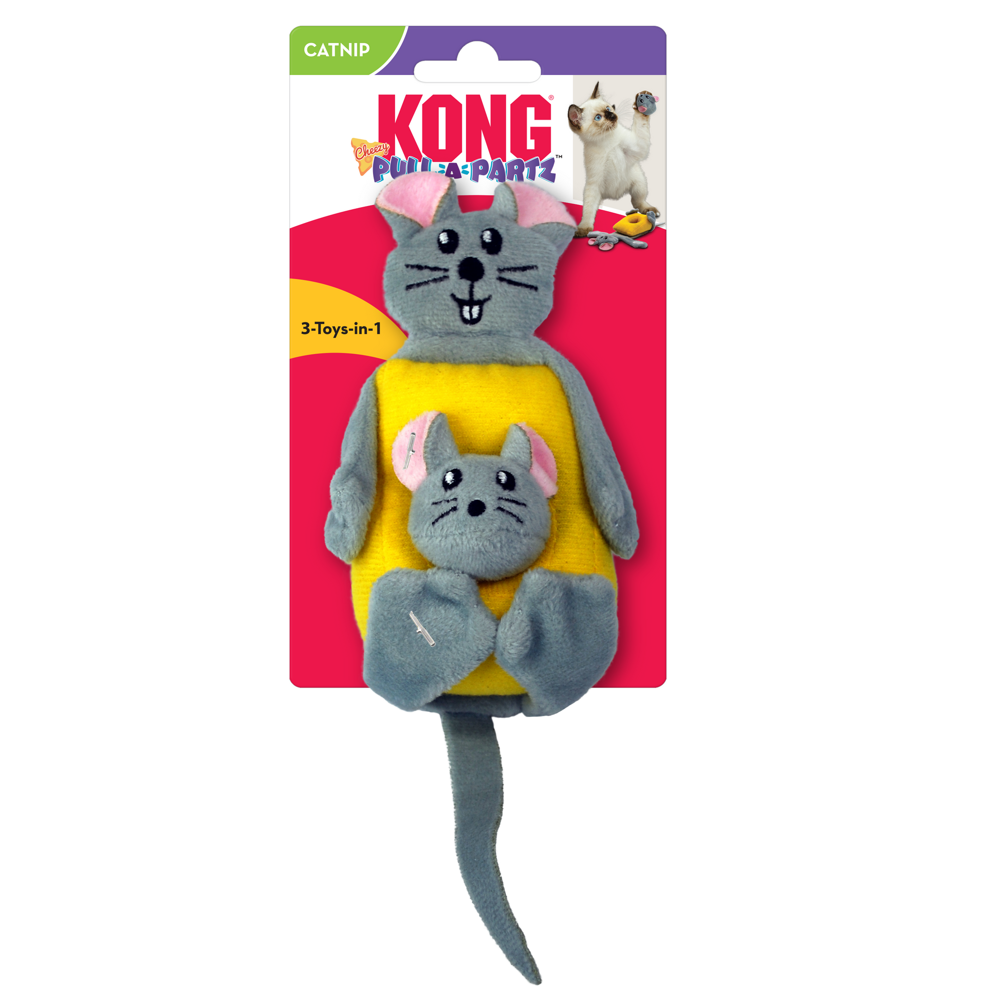 O KONG Pull-a-Partz Cheezy oferece um parque de diversões ilimitado, satisfazendo até mesmo os gatos mais curiosos. Apresentando três brinquedos em um, o tecido aderente permite que os gatos desmontem o brinquedo repetidamente, satisfazendo às necessidades naturais de caça e captura. O grande e ruidoso rato apresenta pernas e braços longos, convidando para a luta de corpo inteiro e chutes, enquanto o brinquedo removível em formato de queijo satisfaz aos instintos de bater e capturar. Preenchido com KONG North American Premium Catnip, este brinquedo garante infinitas horas de brincadeira.