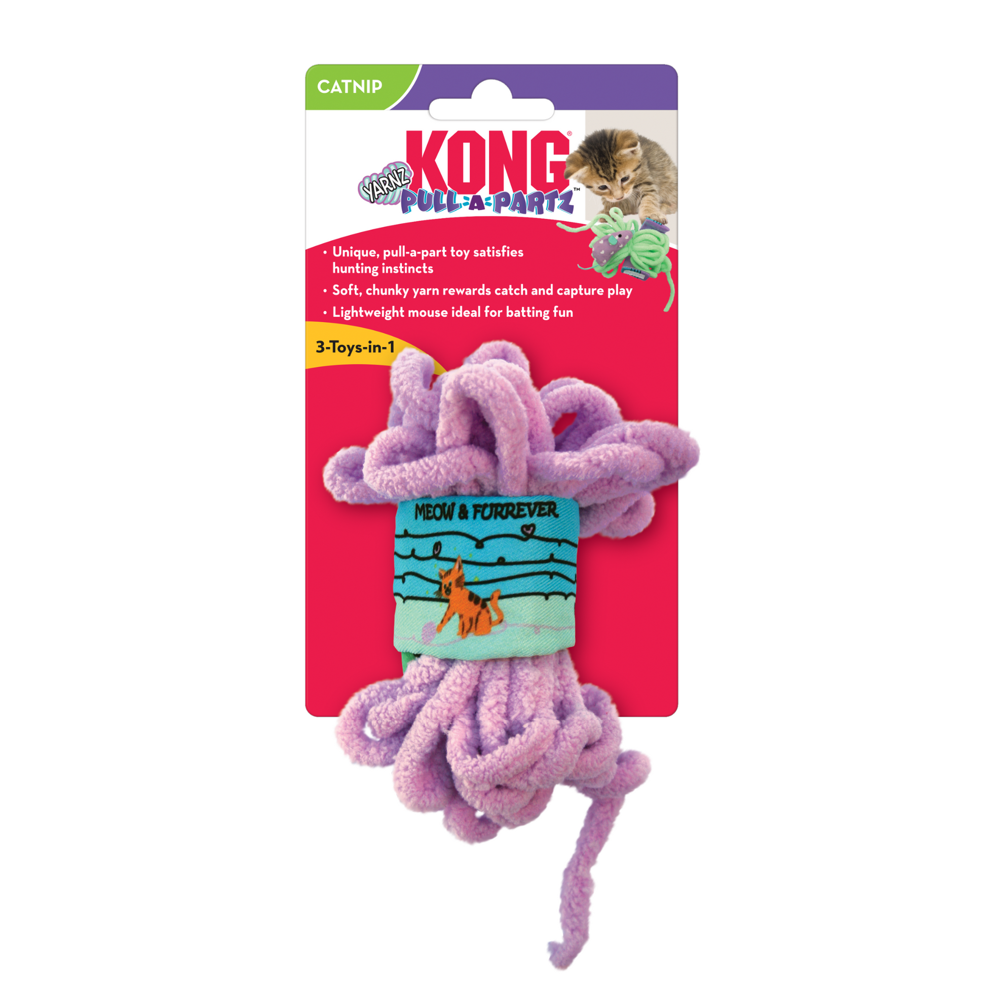 O KONG Pull-A-Partz Yarnz oferece 3 brinquedos em 1 que convidam os gatinhos a desmontar um pacote de diversão que satisfaz os seus instintos de caça. A bola de fios não desenrola, mas a diversão sim, quando os gatos são recompensados com as brincadeiras de captura. O leve ratinho no interior continua a brincadeira estimulando as rebatidas e patadas. Um revestimento exterior com sons de estalo aumenta e estimula o desafio mental e o catnip KONG North American Premium prolonga a diversão.