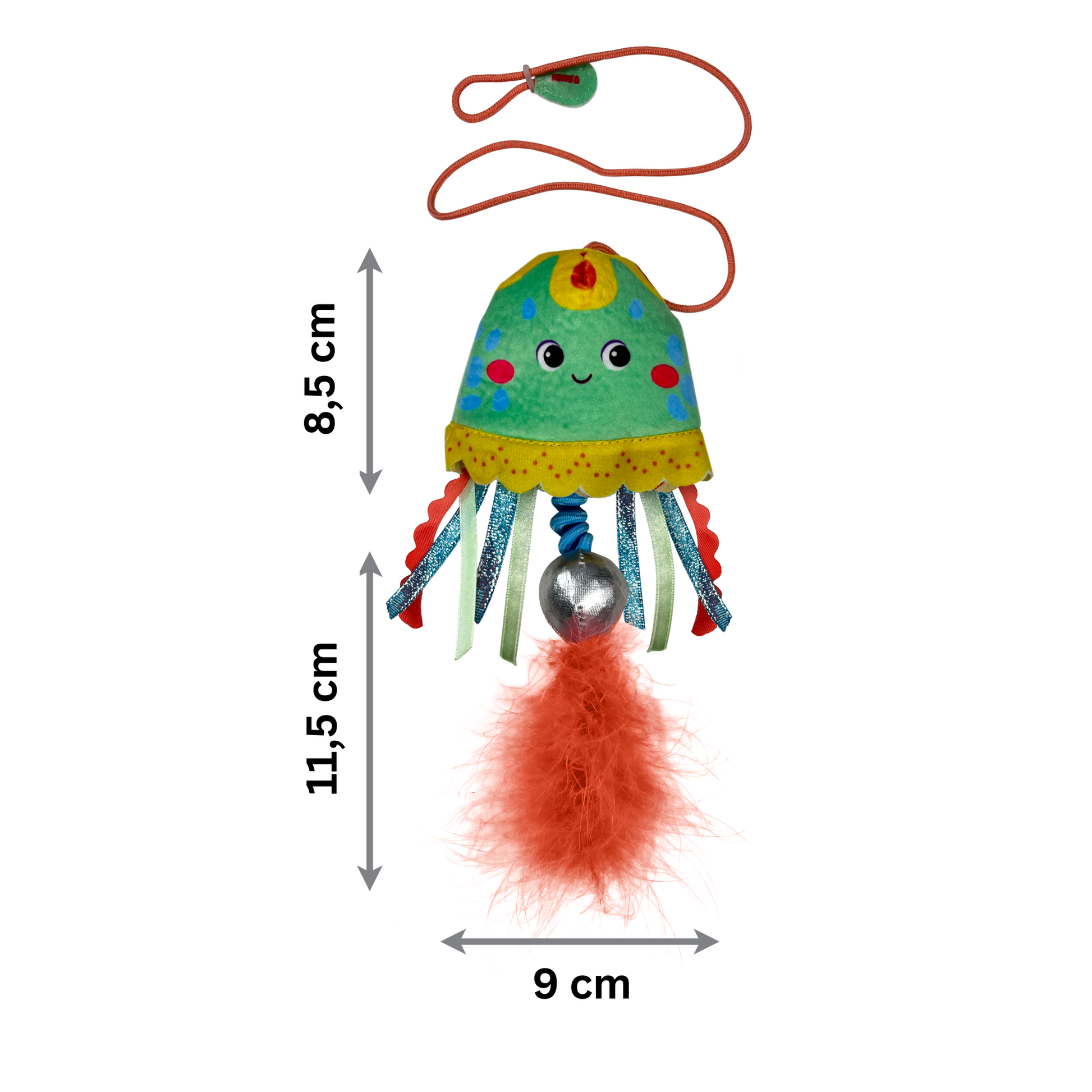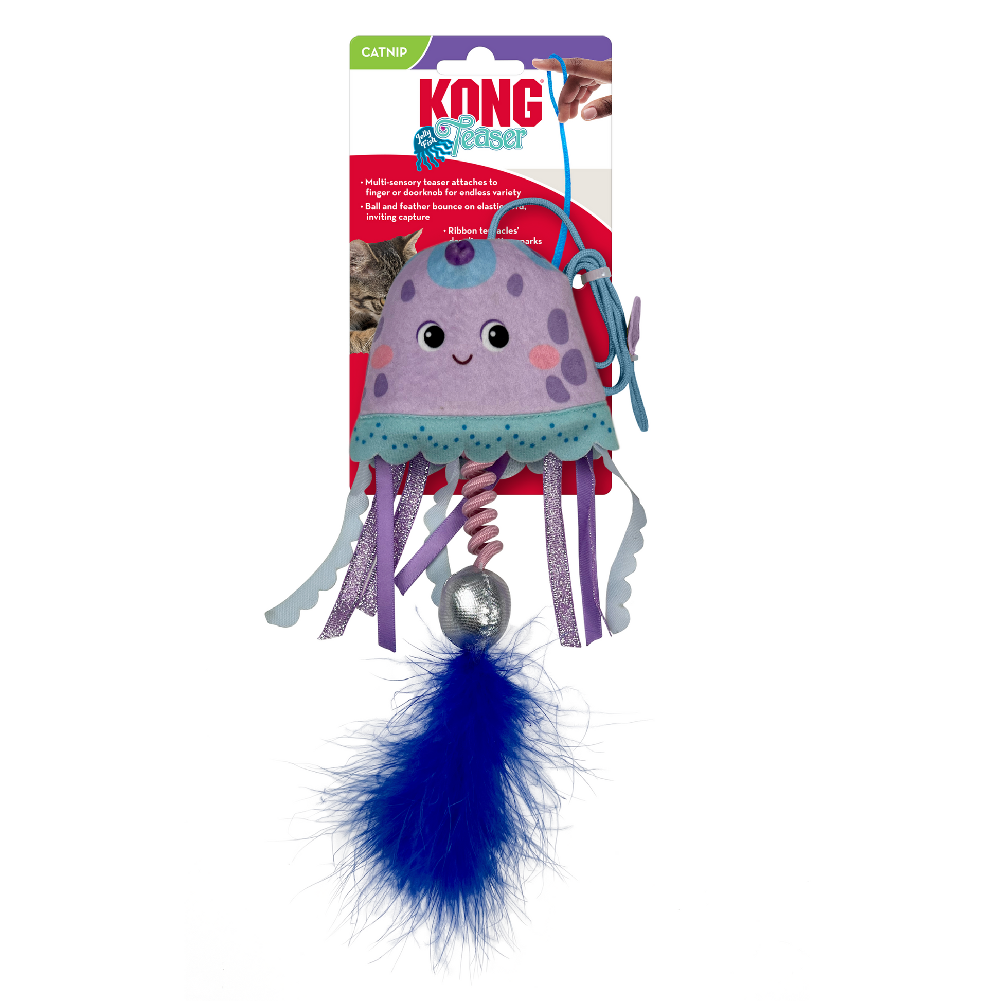 O KONG Jellyfish Teaser oferece uma experiência multissensorial que satisfaz os instintos naturais do gato. Pode ser preso ao dedo, puxador ou maçaneta para brincadeiras interativas ou independentes. A bola com penas salta num cordão elástico, convidando à perseguição, enquanto os tentáculos de fita pendentes estimulam o instinto de caça. O guizo, o som crepitante e a erva-gateira KONG Premium North American Catnip mantêm o interesse por mais tempo.