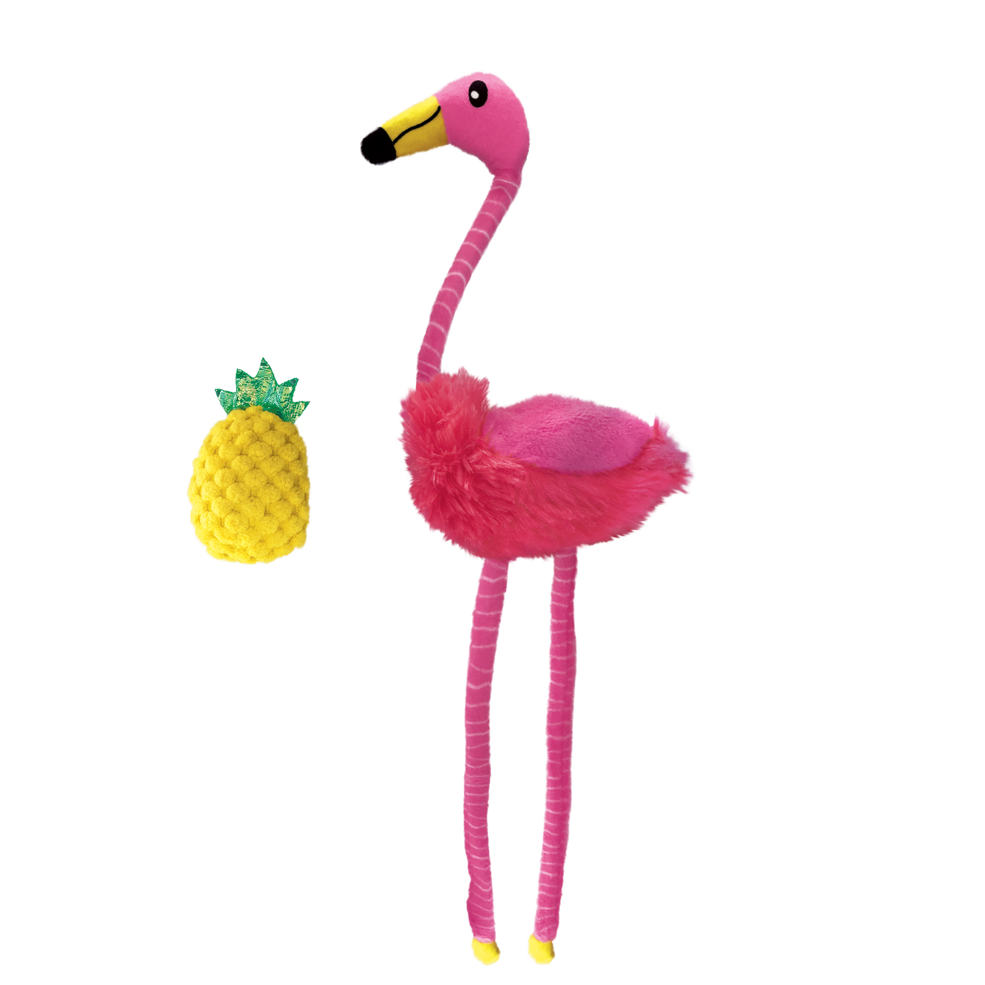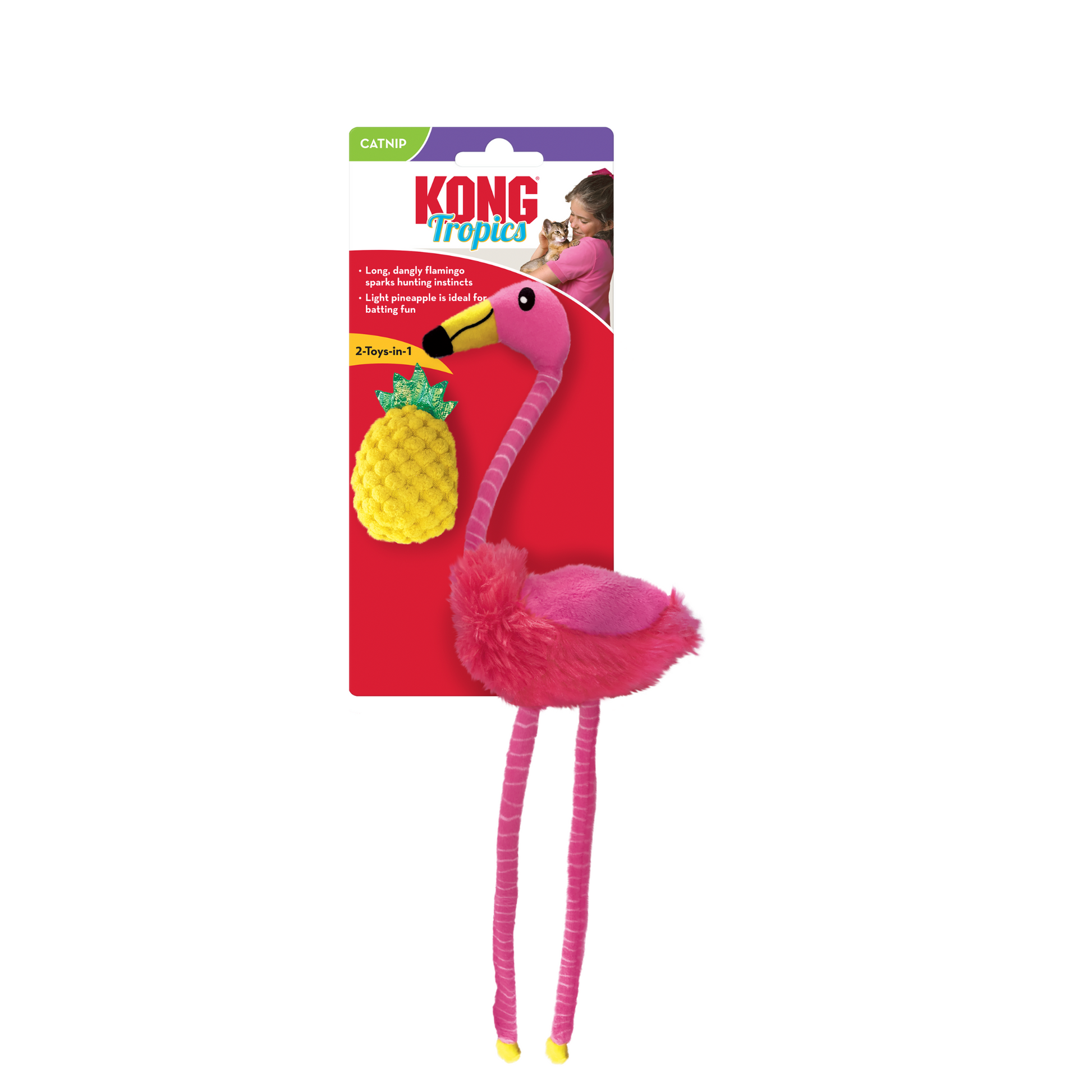 As pernas, pescoço longos e os estalidos do flamingo convidam para brincadeiras de arrastar e capturar. Um pequeno abacaxi leve que aguça e recompensa brincadeiras de rebater. A catnip KONG North American Premium nos dois brinquedos mantém a ação tropical.