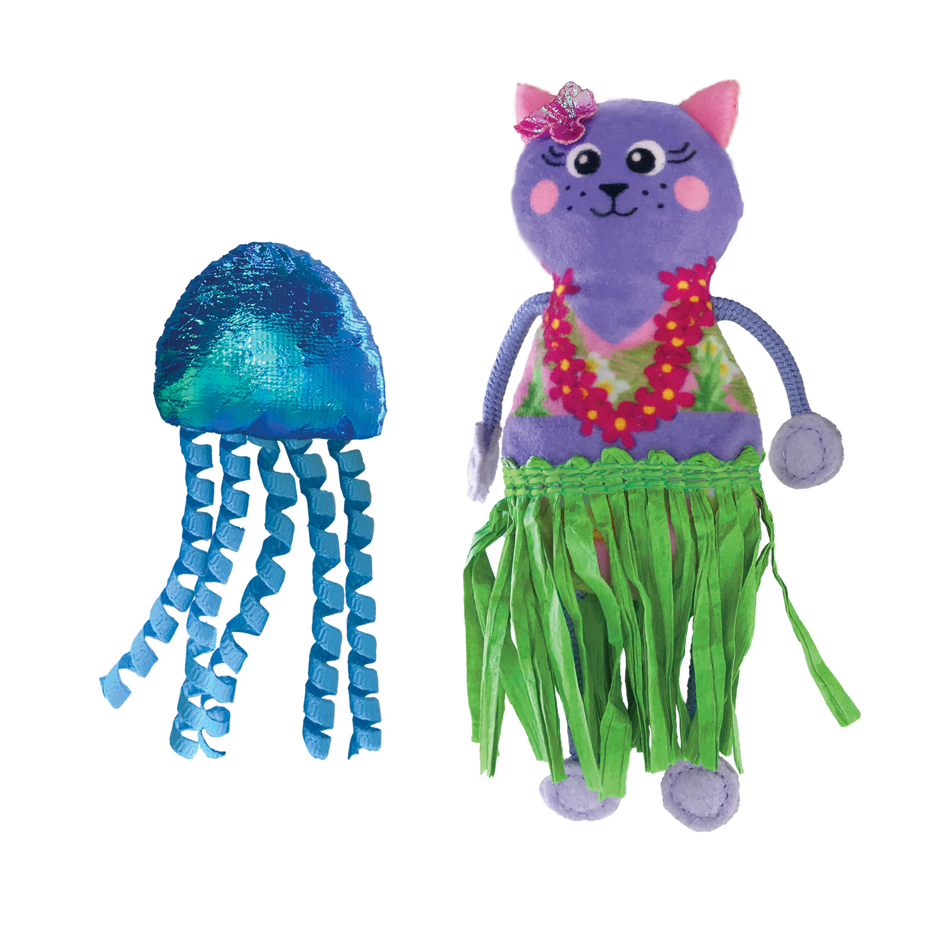 Os dois brinquedos do KONG Cat Tropics Hula Kitty trazem diversão em dobro. Os estalos, a saia rodada de grama e os braços de corda da gatinha aguçam os instintos de caça. Uma água-viva brilhante e chamativa pede para ser rebatida, com seus tentáculos encurvados irresistíveis para brincadeiras de captura. A KONG North American Premium Catnip nos dois brinquedos mantém a ação tropical.