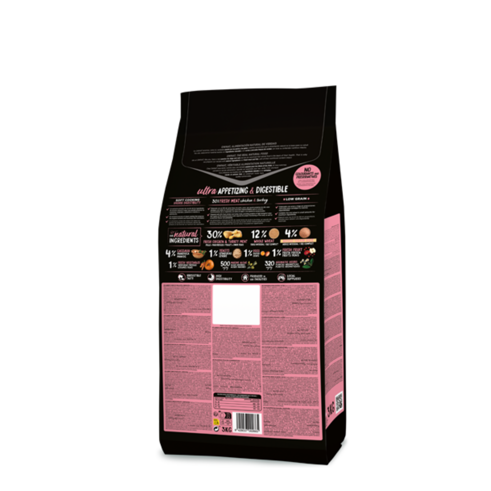 Frango fresco* (15 % min. antes de cozinhar), peru fresco* (15 % min. antes de cozinhar), hidrolisado de salmão (12 %), trigo* (12 %), frango desidratado (9 %), gordura avícola (preservada com antioxidantes naturais), proteína de trigo, proteínas de milho, raízes de mandioca* (4 %), porco desidratado (4 %), arroz* (4 %), lenhinocelulose, legumes e frutas frescas antes da cozinhar (maçã* 1 %, cenoura* 0,5 %, abóbora* 0,5 %), salmão desidratado (2 %), proteína hidrolisada de frango, óleo de salmão (preservado com antioxidantes naturais), leveduras (nucleotídeos)* (1 %), ovo desidratado* (1 %), polpa de beterraba, sal-gema*, raízes de chicória (FOS)*, extrato de levedura (MOS), alfalfa desidratada*, algas marinhas desidratadas* (500 mg/kg), glucosamina (500 mg/kg), yucca shidigera, sulfato de condroitina (100 mg/kg), arandos* (100 mg/kg), chá verde* (80 mg/kg), equinácea* (80 mg/kg), flor de camomila* (80 mg/kg), funcho* (80 mg/kg). *Ingredientes naturais