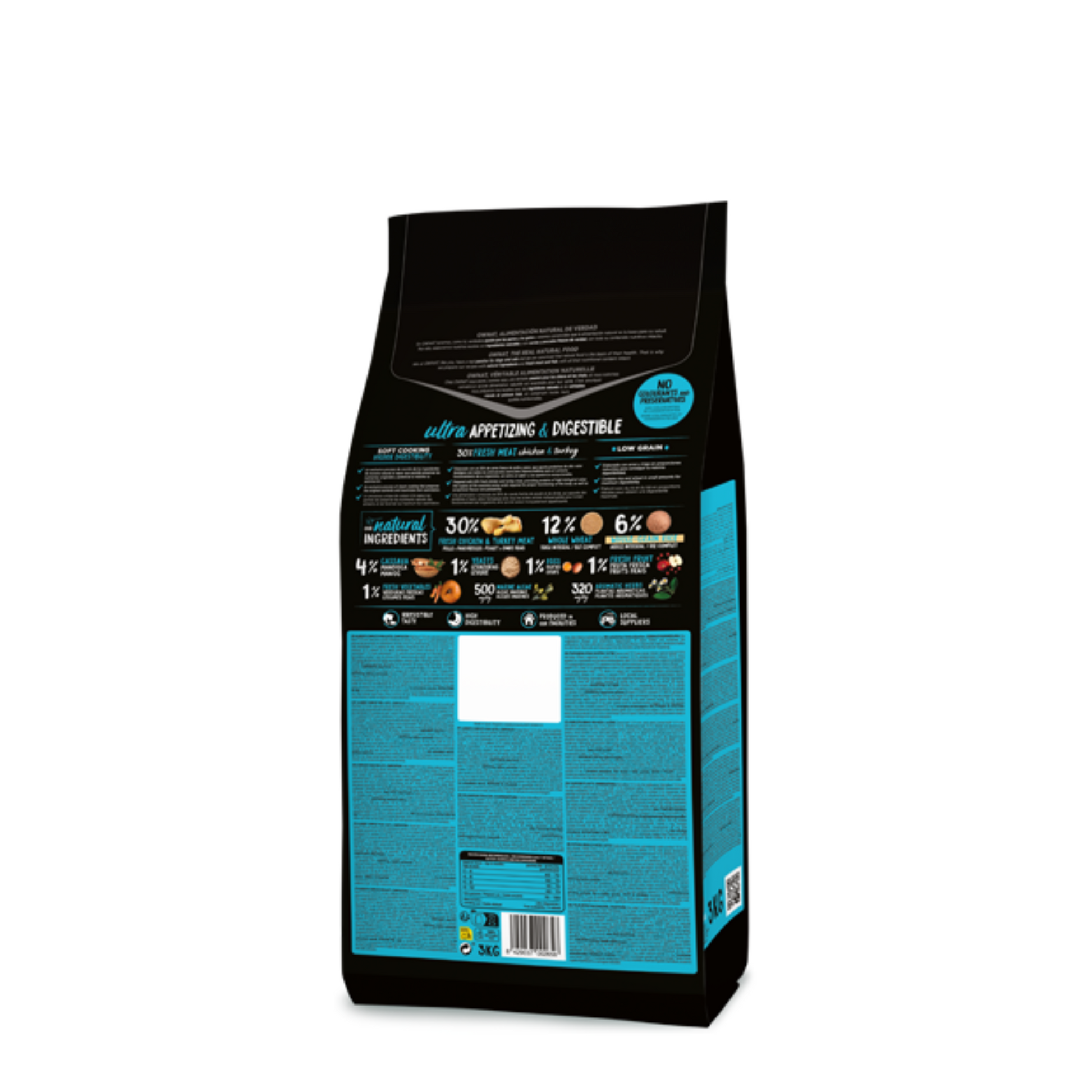 Frango fresco* (15 % min. antes de cozinhar), peru fresco* (15 % min. antes de cozinhar), hidrolisado de salmão (12 %), trigo* (12 %), frango desidratado (10 %), gordura avícola (preservada com antioxidantes naturais), arroz* (6 %), proteína de trigo, raízes de mandioca* (4 %), porco desidratado (3 %), proteínas de milho, legumes e frutas frescas antes da cozinhar (maçã* 1 %, cenoura* 0,5 %, abóbora* 0,5 %), salmão desidratado (2 %), proteína hidrolisada de frango, leveduras (nucleotídeos)* (1 %), ovo desidratado* (1 %), óleo de salmão (preservado com antioxidantes naturais), lenhinocelulose, sal-gema*, raízes de chicória (FOS)*, extrato de levedura (MOS), algas marinhas desidratadas* (500 mg/kg), glucosamina (500 mg/kg), yucca shidigera, sulfato de condroitina (100 mg/kg), arandos* (100 mg/kg), chá verde* (80 mg/kg), equinácea* (80 mg/kg), flor de camomila* (80 mg/kg), funcho* (80 mg/kg). *Ingredientes naturais