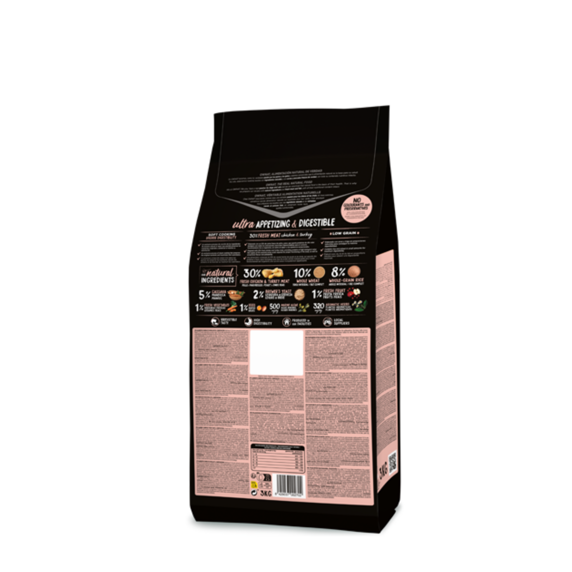 Frango fresco* (15 % min. antes de cozinhar), peru fresco* (15 % min. antes de cozinhar), trigo* (10 %), frango desidratado (10 %), gordura avícola (preservada com antioxidantes naturais), hidrolisado de salmão (8 %), arroz* (8 %), raízes de mandioca* (5 %), proteínas de milho, porco desidratado (4 %), proteína de trigo, legumes e frutas frescas antes da cozinhar (maçã* 1 %, cenoura* 0,5 %, brócolos* 0,5 %), levedura de cerveja* (2 %), proteína hidrolisada de frango, lenhinocelulose, óleo de salmão (preservado com antioxidantes naturais), ovo desidratado* (1 %), polpa de beterraba, sal-gema*, alfalfa desidratada*, raízes de chicória (FOS)*, extrato de levedura (MOS), algas marinhas desidratadas* (500 mg/kg), glucosamina (500 mg/kg), yucca shidigera, sulfato de condroitina (100 mg/kg), arandos* (100 mg/kg), chá verde* (80 mg/kg), equinácea* (80 mg/kg), flor de camomila* (80 mg/kg), funcho* (80 mg/kg). *Ingredientes naturais