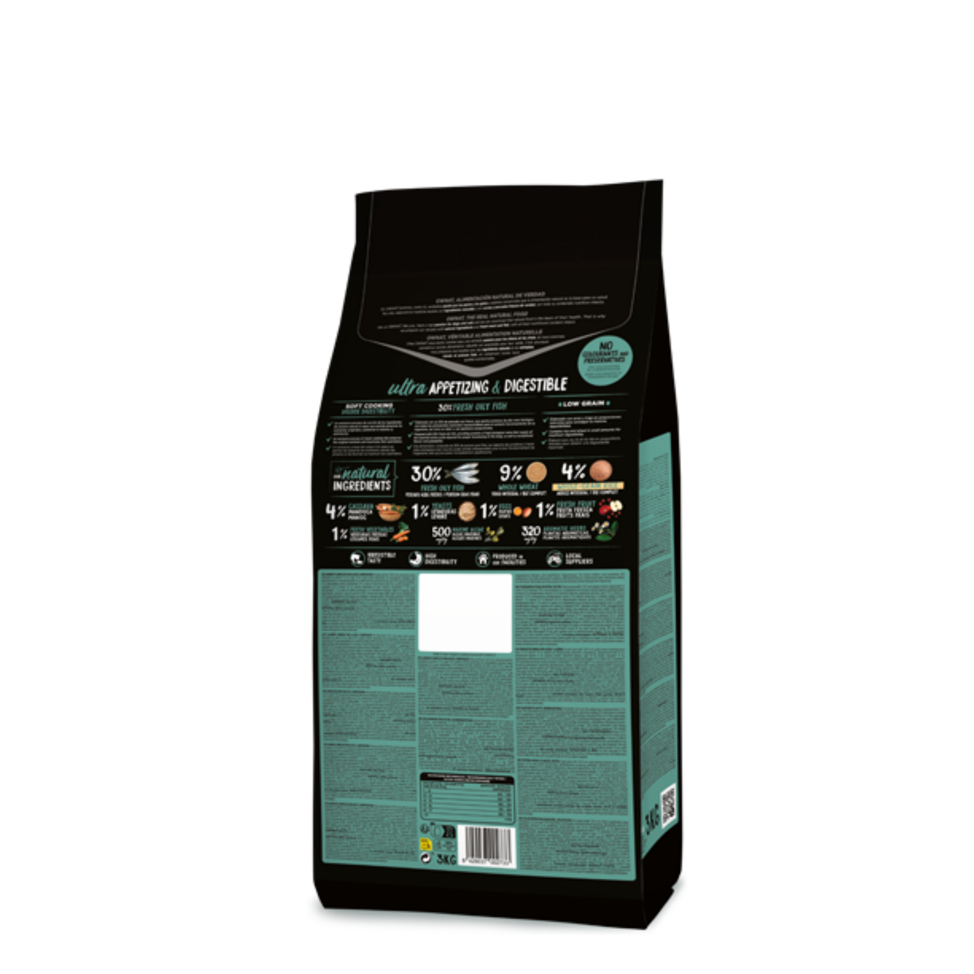 Peixe azul fresco* (30 % min. antes de cozinhar), frango desidratado (12 %), trigo* (11 %), hidrolisado de salmão (10 %), proteínas de milho, raízes de mandioca* (4 %), arroz* (4 %), proteína de trigo, lenhinocelulose, gordura avícola (preservada com antioxidantes naturais), salmão desidratado (3 %), porco desidratado (3 %), legumes e frutas frescas antes da cozinhar (maçã* 1 %, cenoura* 0,5 %, brócolos* 0,5 %), levedura de cerveja* (2 %), proteína hidrolisada de frango, polpa de beterraba, óleo de salmão (preservado com antioxidantes naturais), alfalfa desidratada*, sal-gema*, raízes de chicória (FOS)*, extrato de levedura (MOS), algas marinhas desidratadas* (500 mg/kg), glucosamina (500 mg/kg), yucca shidigera, sulfato de condroitina (100 mg/kg), arandos* (100 mg/kg), chá verde* (80 mg/kg), equinácea* (80 mg/kg), flor de camomila* (80 mg/kg), funcho* (80 mg/kg). *Ingredientes naturais