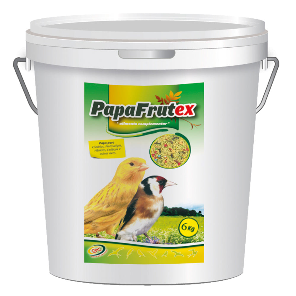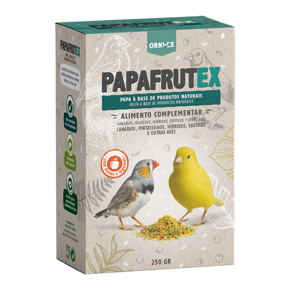 PAPAFRUTEX é uma papa à base de produtos naturais para aves granívoras. É recomendado o seu uso durante todo o ano. É um alimento complementar que proporciona o desenvolvimento equilibrado das aves, corrigindo as suas carências em frutas e verduras.