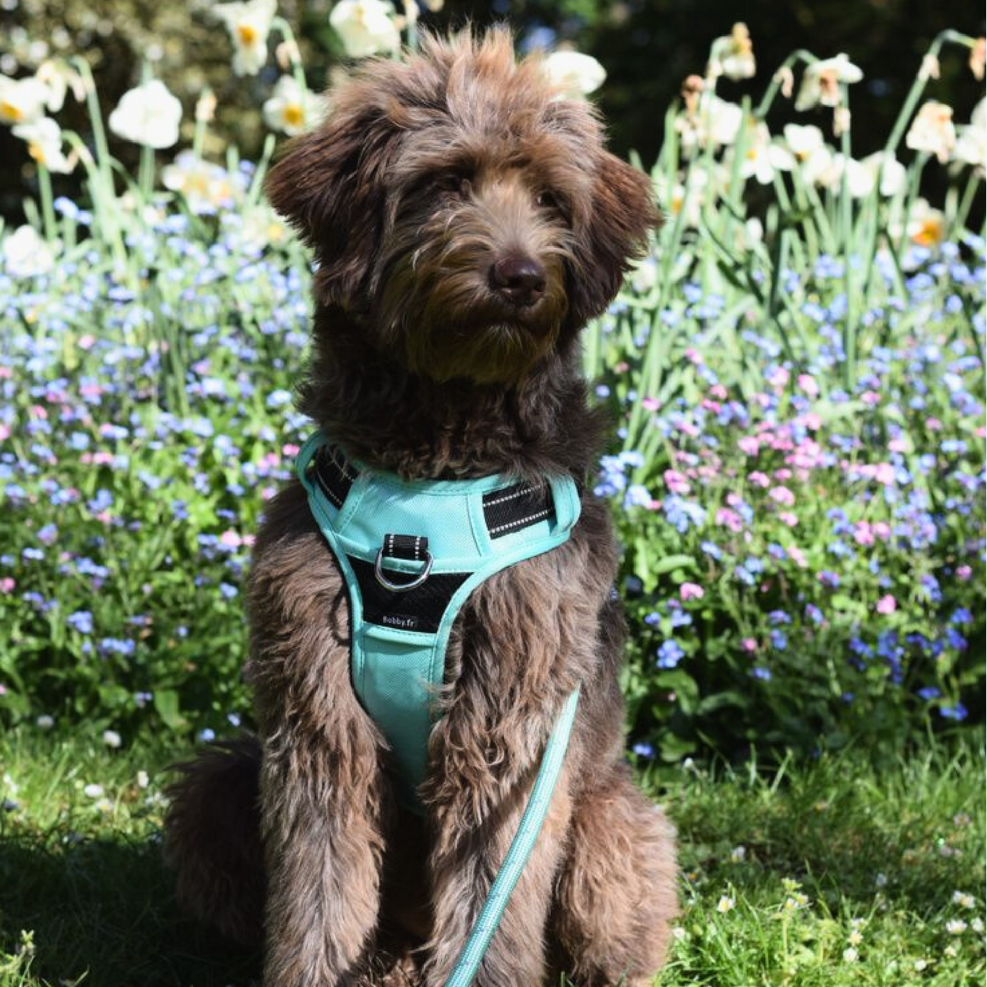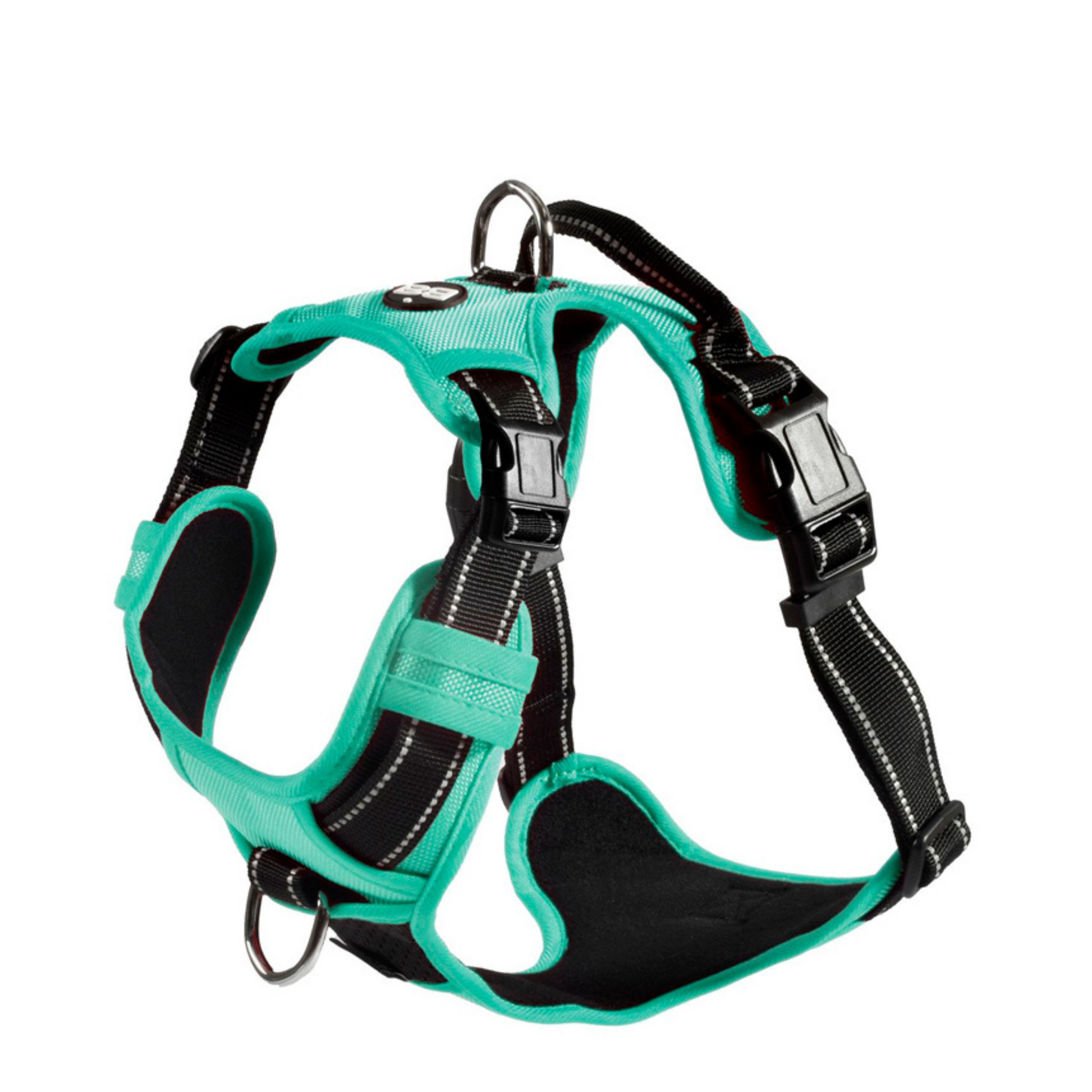 - 2 pontos de fixação, à frente e atrás: com o seu ponto de fixação situado na parte da frente do arnês, ensina o seu cão a andar a passo e reduz consideravelmente os puxões repetitivos;