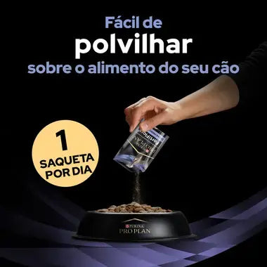- Fácil de usar: O conteúdo das saquetas pode ser facilmente polvilhado sobre o alimento habitual do cão, uma vez por dia.