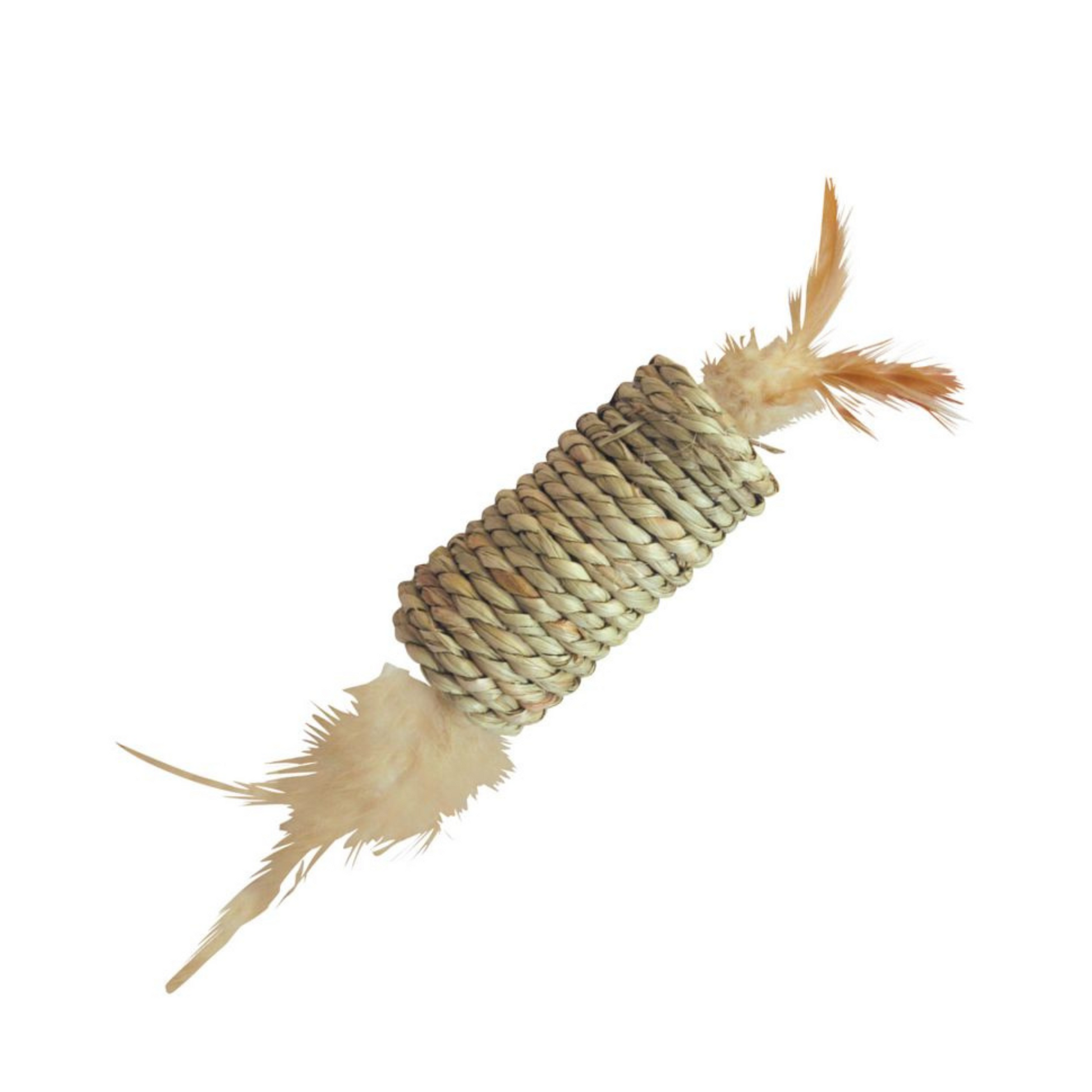 Brinquedo para gato. Formato de rolo feito com ervas marinhas e penas para chamar a atenção. Com catnip. Use com supervisão. Remova o brinquedo se estiver danificado.