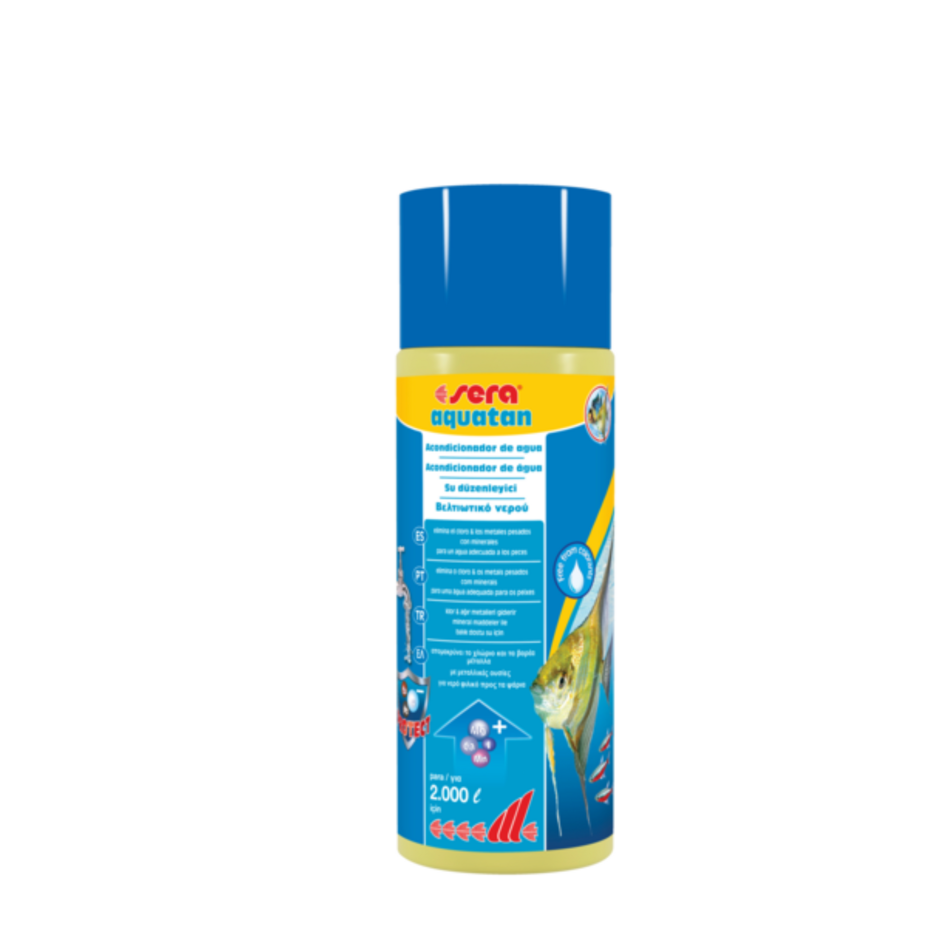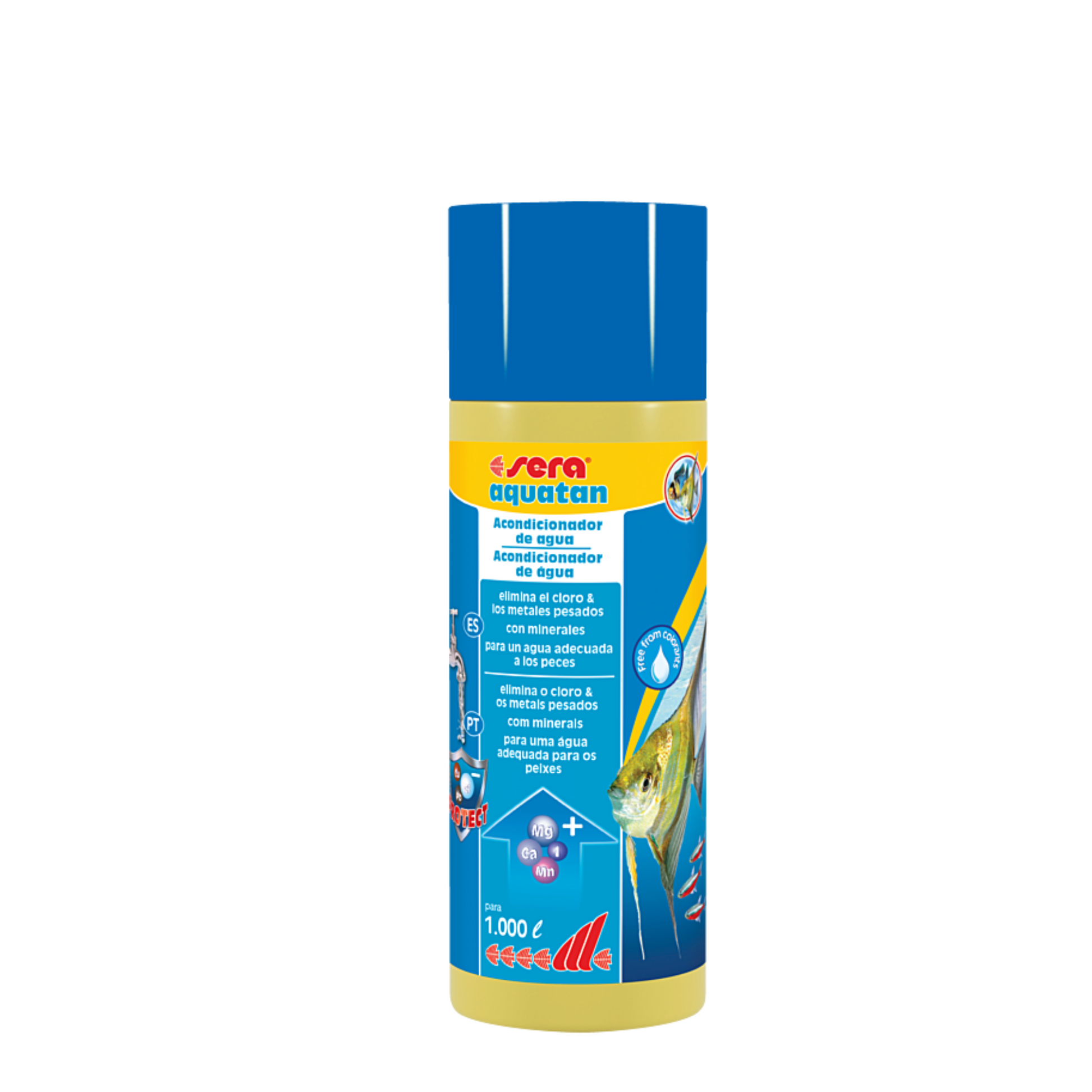 sera aquatan acondiciona a água da torneira, transfomando-a imediatamente em água adequada para os peixes e saudável. Elimina os poluentes, como cloro e as cloraminas, aglutina os metais pesados (p. ex. cobre, zinco ou chumbo) e protege contra a amónia. Ao mesmo tempo, adiciona à água minerais importantes em forma biodisponível com vantagens para peixes, plantas, invertebrados e micro-organismos úteis:
