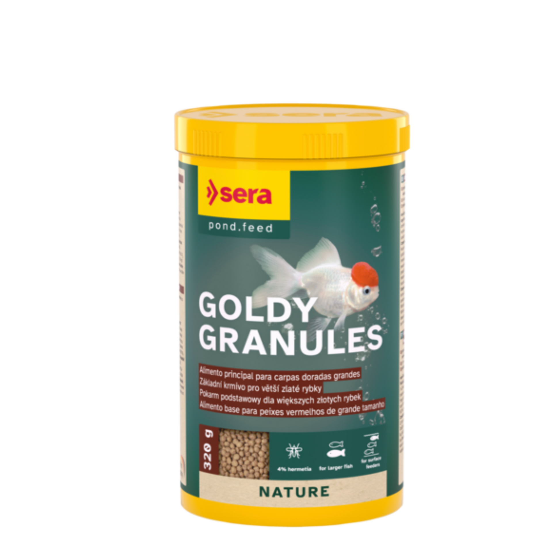 sera Goldy Gran Nature é o alimento base, composto por granulado cuidadosamente processado, sem corantes e conservantes, indicado para peixes vermelhos de maior dimensão e outras variedades mais exigentes de peixes de água fria.