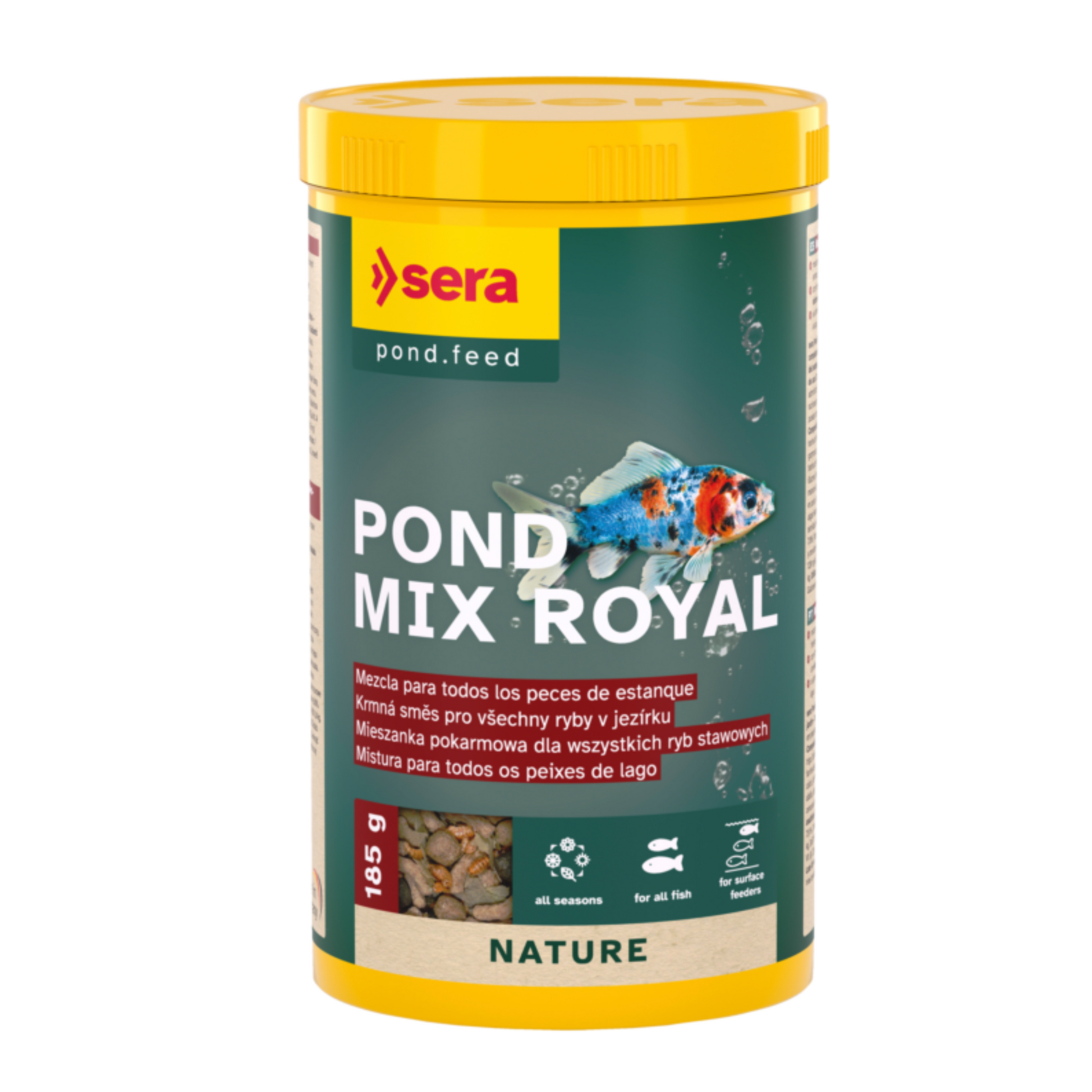 Sera Pond Mix Royal Nature é o alimento base composto por flocos, granulados e gammarus inteiros cuidadosamente processados, para a alimentação durante todo o ano, em lagos com uma população mista. Naturalmente, não contém corantes nem conservantes.
