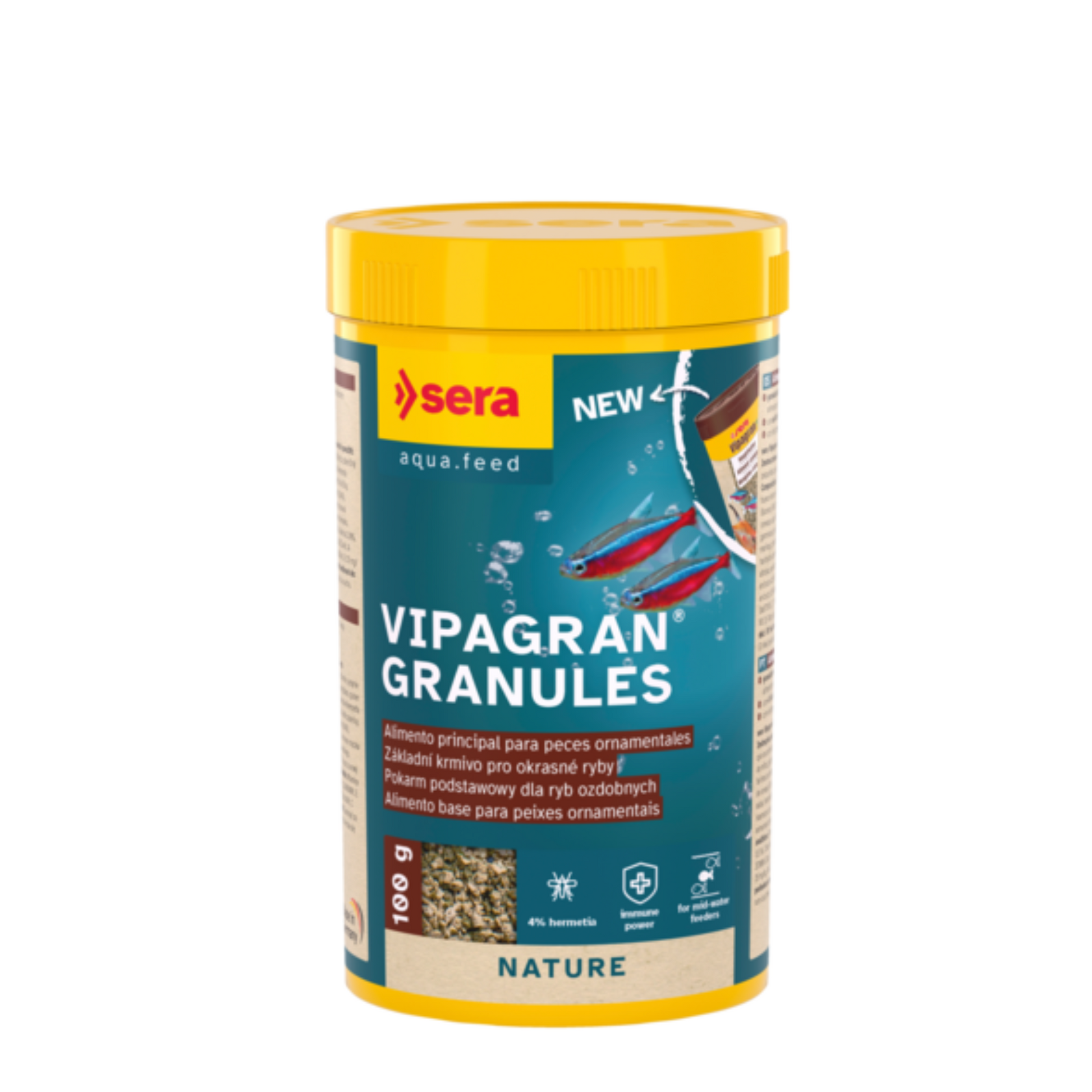 Sera Vipagran Nature é o alimento base, composto por granulado macio, cuidadosamente processado, sem corantes e conservantes, indicado para todos os peixes que comem na zona média da água.