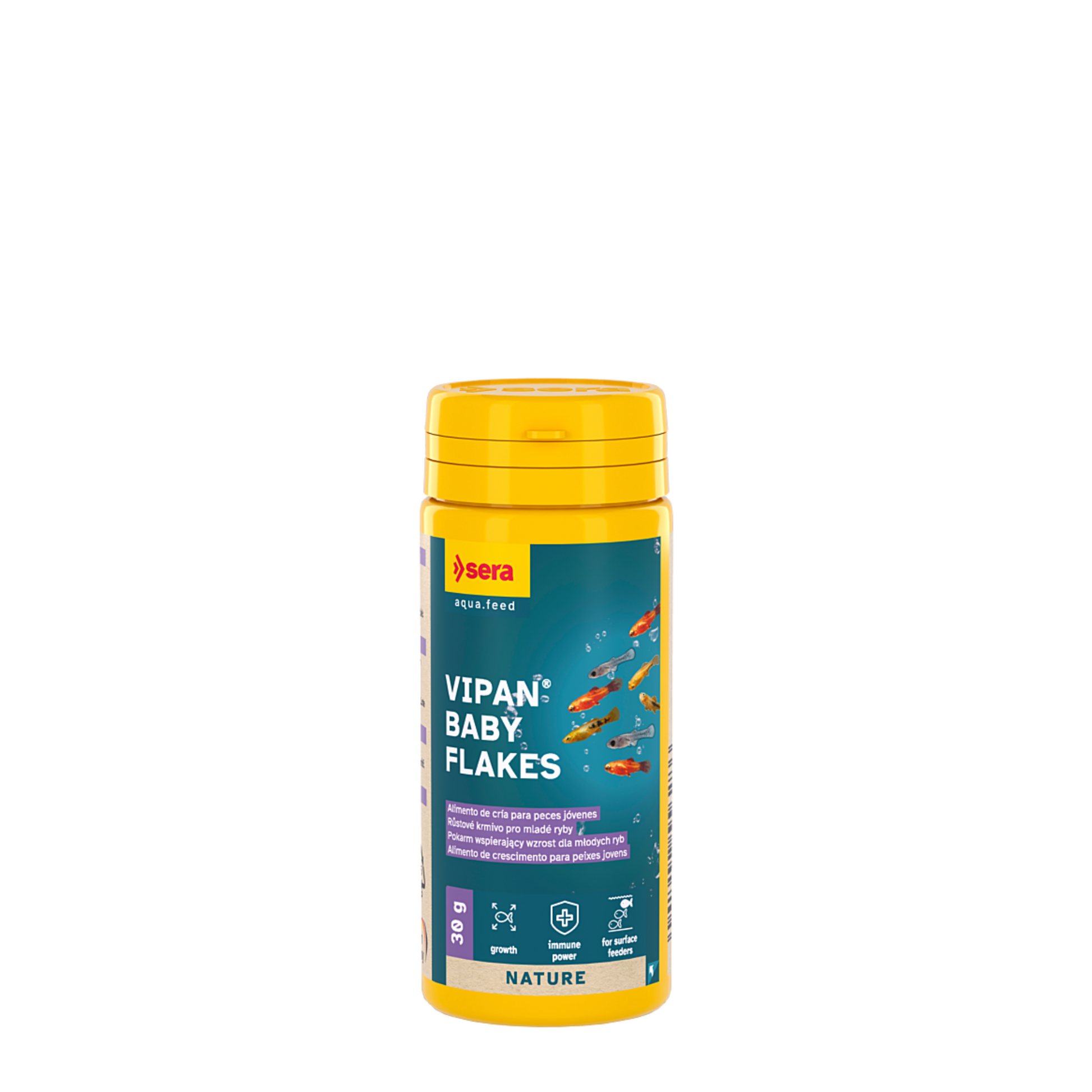sera Vipan Baby Nature é o alimento de crescimento sem corantes nem conservantes, composto por microflocos cuidadosamente processados, para todos os peixes jovens que se alimentam na superfície da água.