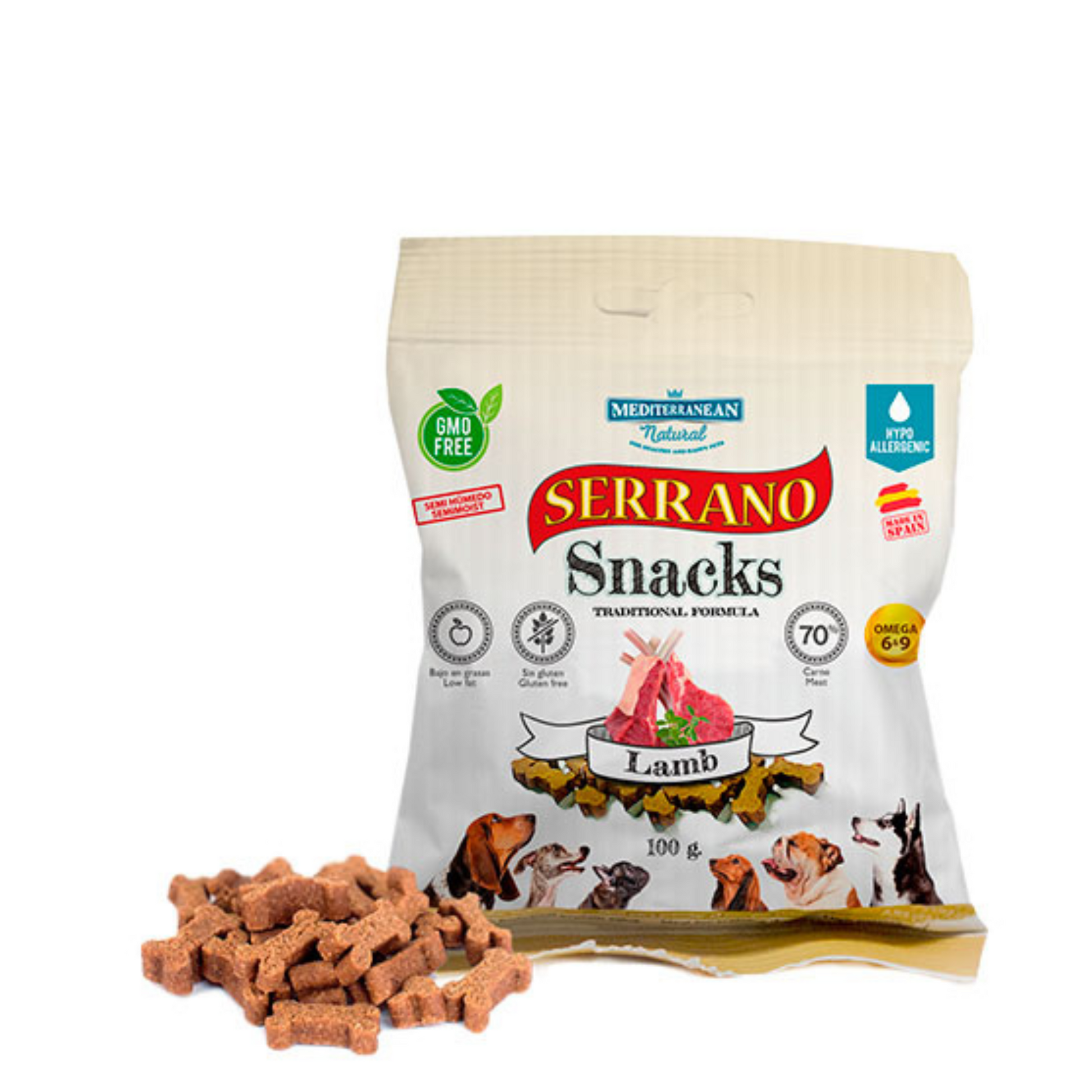 Os Snacks Serrano NATURAIS MEDITERRÂNEOS, delicadamente cortados em pequenos pedaços em forma de osso, garantem a segurança do seu animal de estimação, mantendo todos os seus nutrientes, refletindo uma dieta natural e contendo 70% de carne (60% nos “Snacks Serrano para cachorros”).